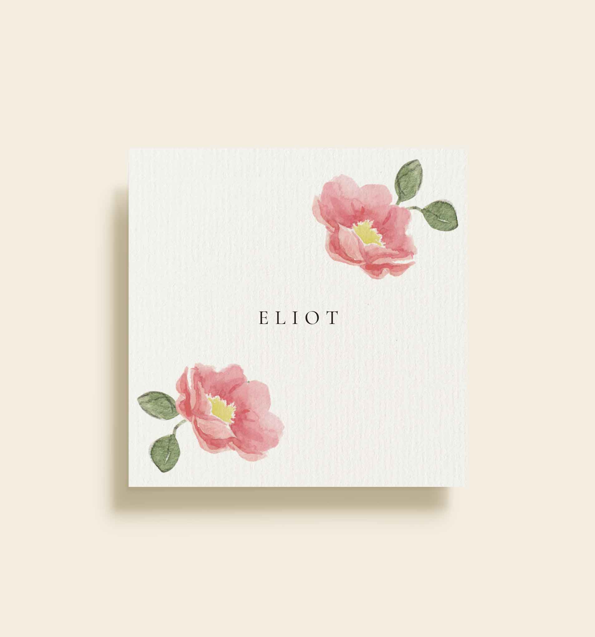 Skab en smuk og personlig borddækning med dette bordkort fra Agnete og Jonas Bryllup kollektionen. De håndmalede akvarelblomster i rosa toner giver kortet et romantisk og let udtryk, mens navnet står centralt og tydeligt på kortet.