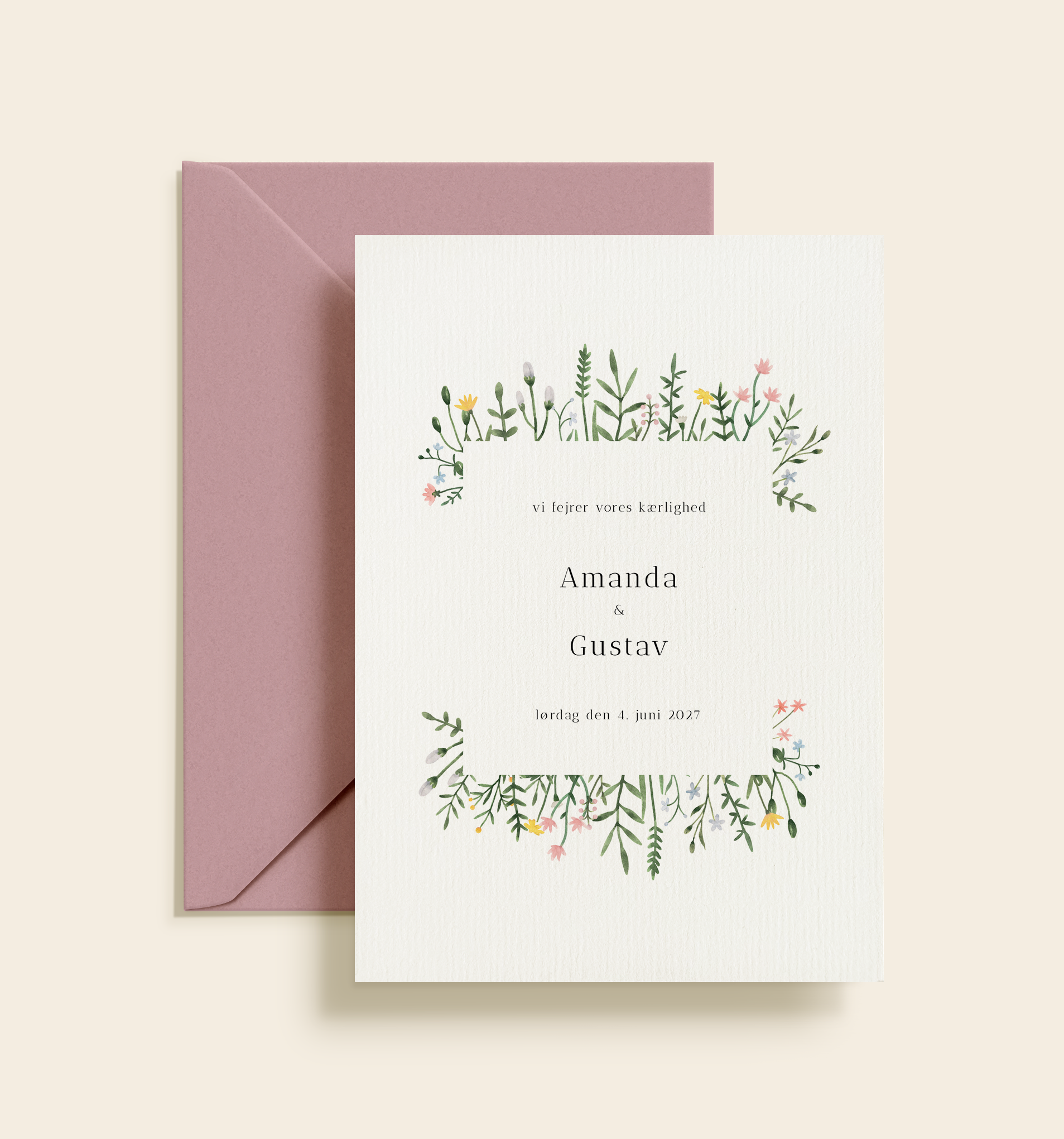 Blomsterkransen tilfører en sans for natur, sommer og lethed, hvilket gør invitationen oplagt til forårs- og sommerbryllupper, men også smuk året rundt. Det rolige design gør det nemt at kombinere invitationen med matchende bryllupspapir såsom save the date, menukort, bordkort og takkekort, så I kan skabe en sammenhængende visuel stil gennem hele brylluppet.