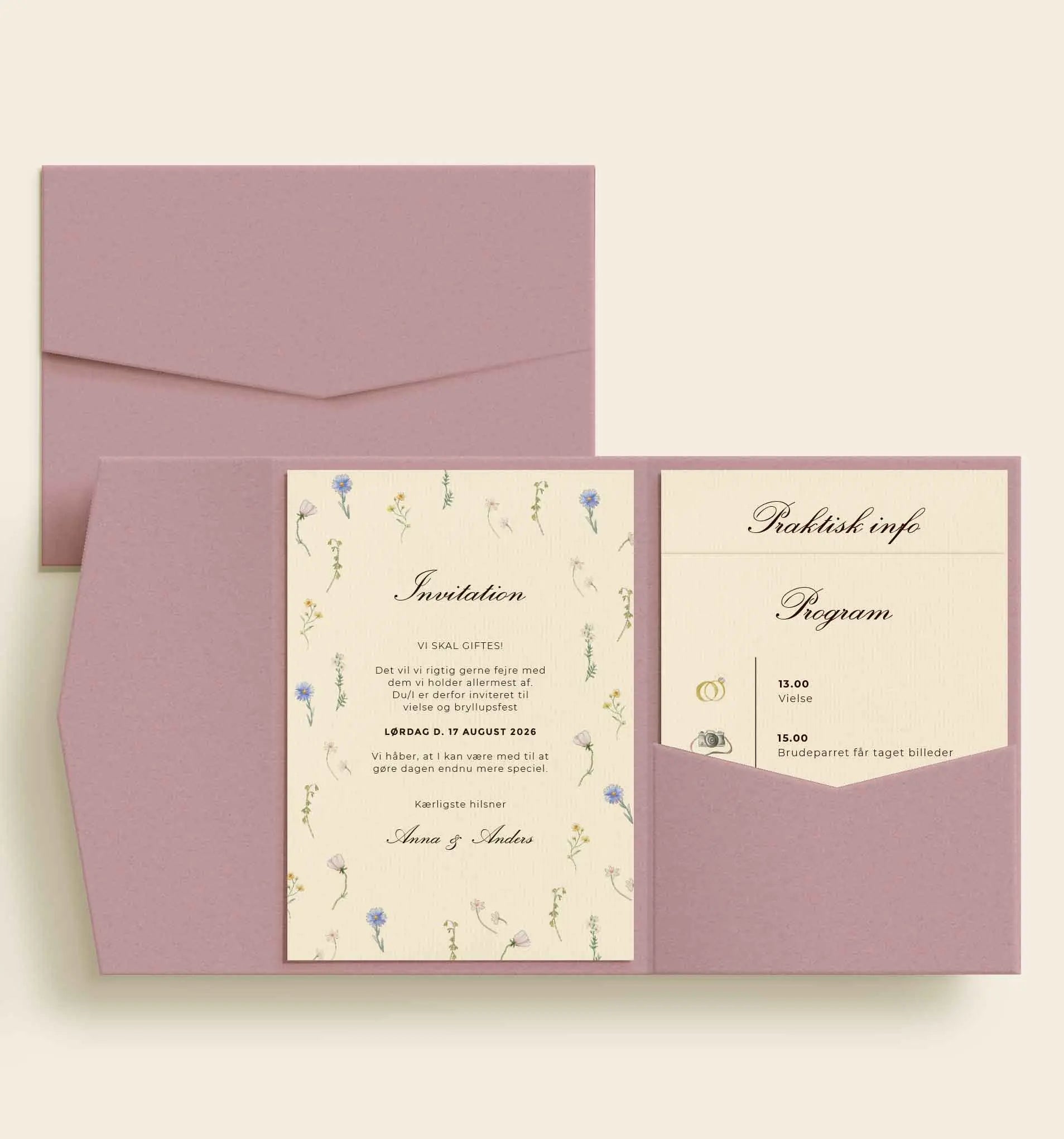 Elegant lommekuvert i støvet rosa nuance, designet til at samle hele bryllupsinvitationen i én smuk helhed. Invitationen placeres til venstre, mens tre tillægskort – praktisk info, program og overnatning – ligger samlet i lommen til højre. Selve designet kombinerer den afdæmpede rosa farve med et romantisk blomsterprint og et let, klassisk udtryk, sammensat med en elegant typografi, der skaber en eksklusiv og gennemført præsentation.