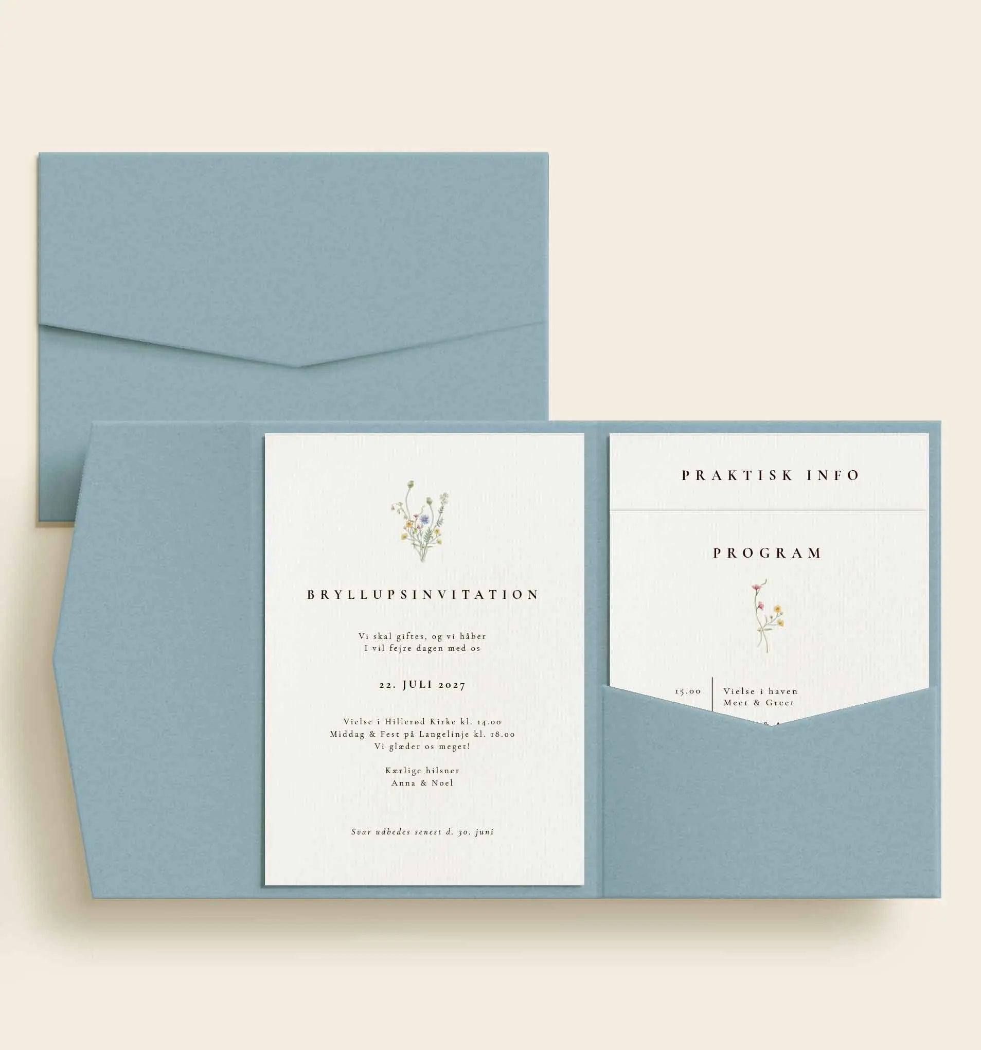 Stilren lommekuvert i en afdæmpet støvet blå nuance, der samler hele bryllupsinvitationen i én elegant løsning. Invitationen placeres til venstre, mens op til tre tillægskort – praktisk info, program og overnatning – ligger samlet i lommen til højre. Designet er enkelt og tidløst med en lille blomsterillustration øverst og et roligt, nordisk udtryk, sammensat med en klassisk typografi, der giver et eksklusivt og harmonisk helhedsindtryk.
