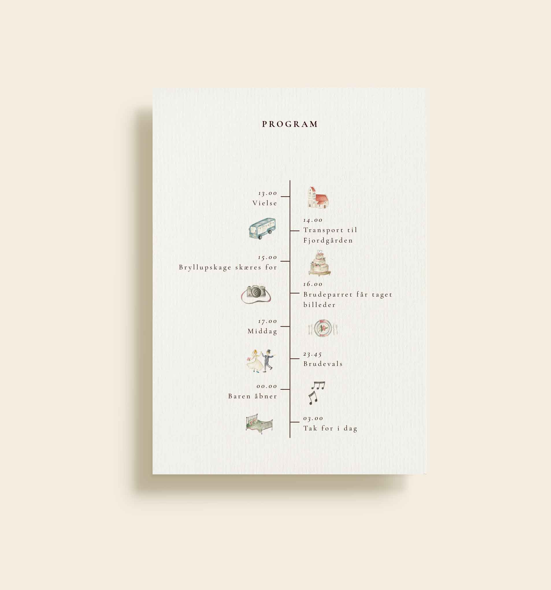 Dette elegante program-tillægskort giver jeres gæster et smukt og overskueligt overblik over bryllupsdagens forløb. Med fine illustrationer og et let, klassisk udtryk bliver programmet både praktisk og dekorativt.