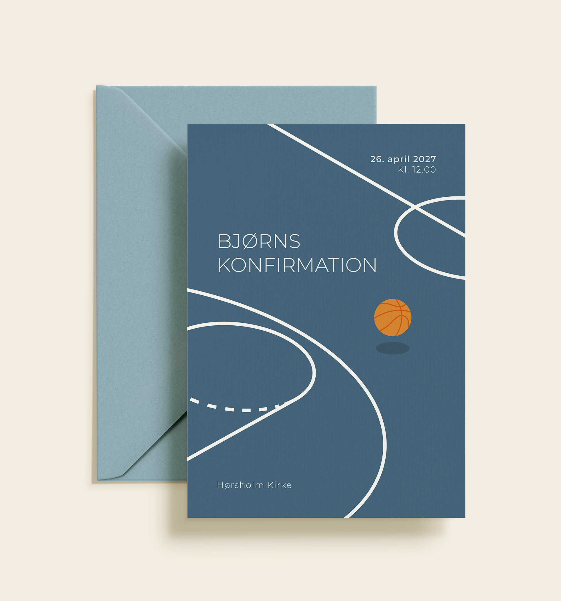 Bjørn-invitationen er en moderne og personlig konfirmationsinvitation med et grafisk basketball-motiv, der tydeligt afspejler konfirmandens interesse for sport og bevægelse. De rene linjer og det rolige farvevalg skaber et stilrent udtryk, mens basketball-detaljen tilfører invitationen karakter og personlighed.