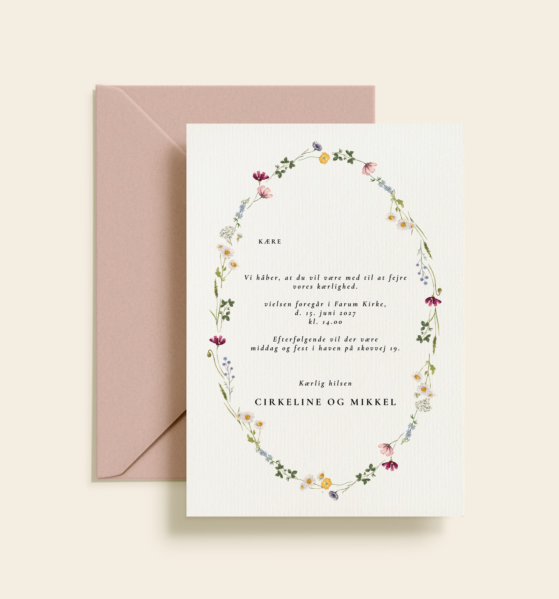 Invitationen er ideel til jer, der drømmer om et romantisk bryllup med botanisk inspiration og et tidløst udtryk. Blomsterkransen symboliserer kærlighed, fællesskab og evighed og gør invitationen til en personlig og stemningsfuld introduktion til jeres store dag.