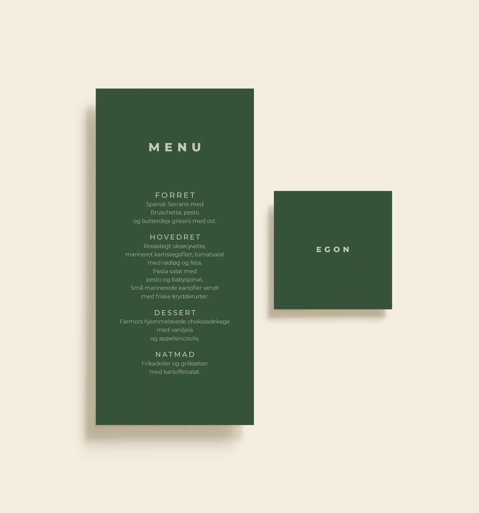 Dette bordkort har et moderne og stilrent udtryk, hvor den dybe grønne farve og den enkle typografi skaber en rolig og elegant borddækning.