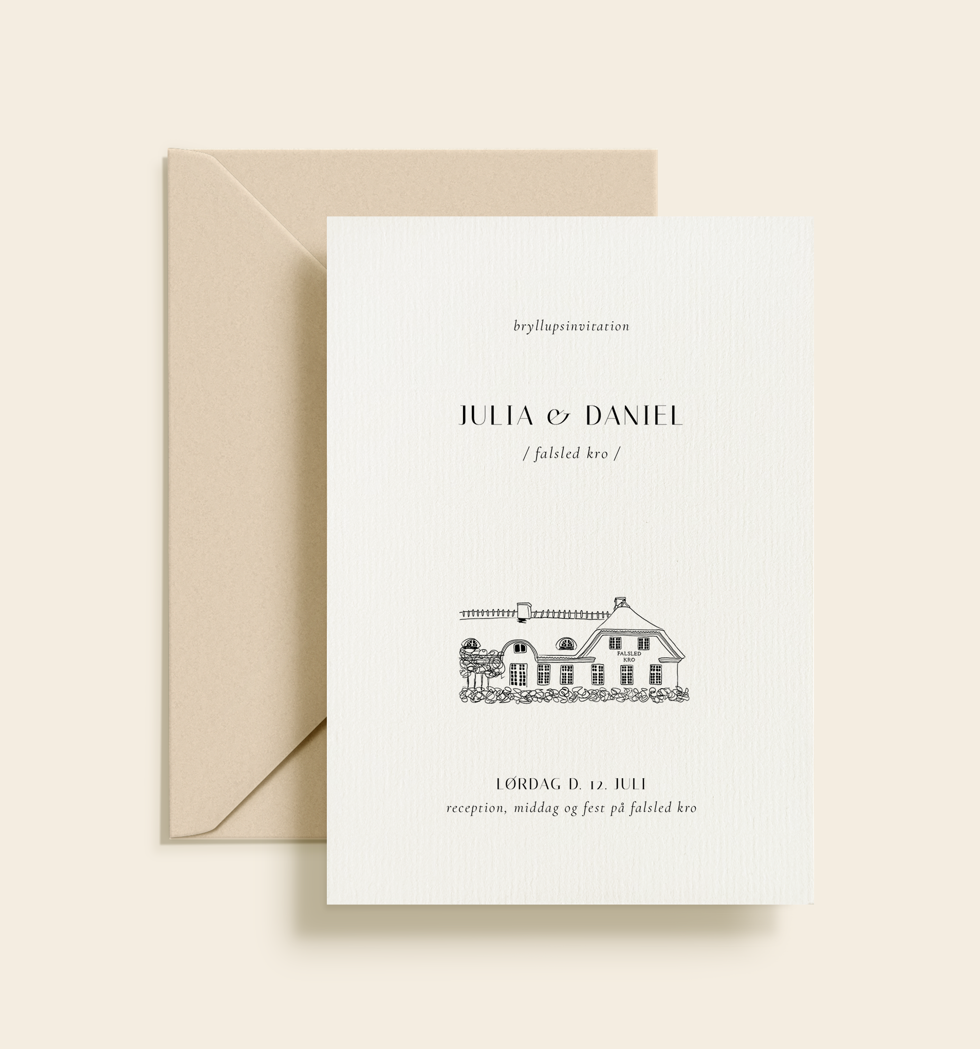 Elegant bryllupsinvitation med håndtegnet illustration af Falsled Kro, klassisk typografi og luftigt layout. Et tidløst og stemningsfuldt design til et romantisk bryllup.