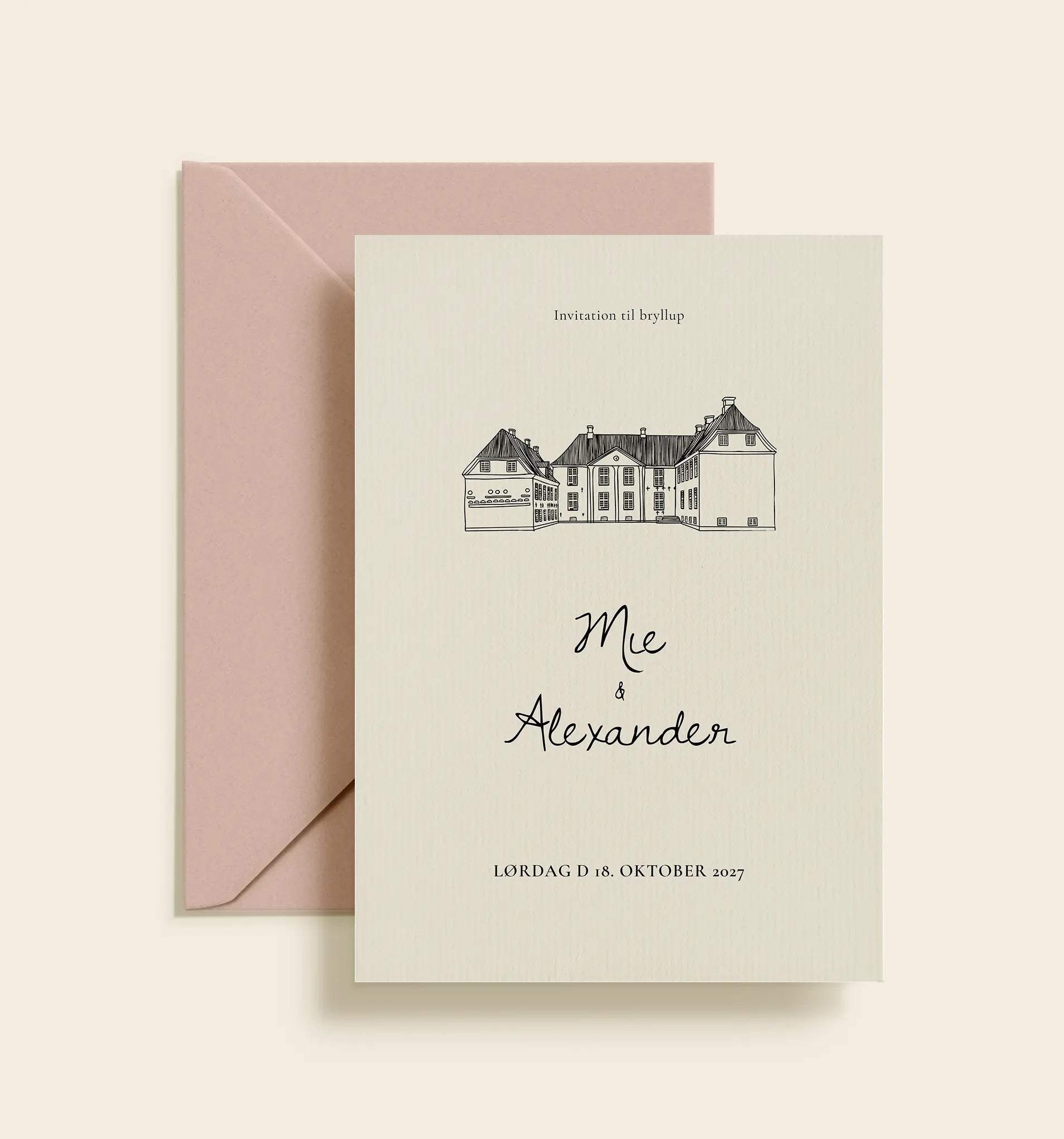 En stilfuld bryllupsinvitation med en detaljeret stregillustration af Gram Slot, trykt på eksklusivt papir og sammensat med en elegant og romantisk typografi der skaber et tidløst og harmonisk udtryk.
