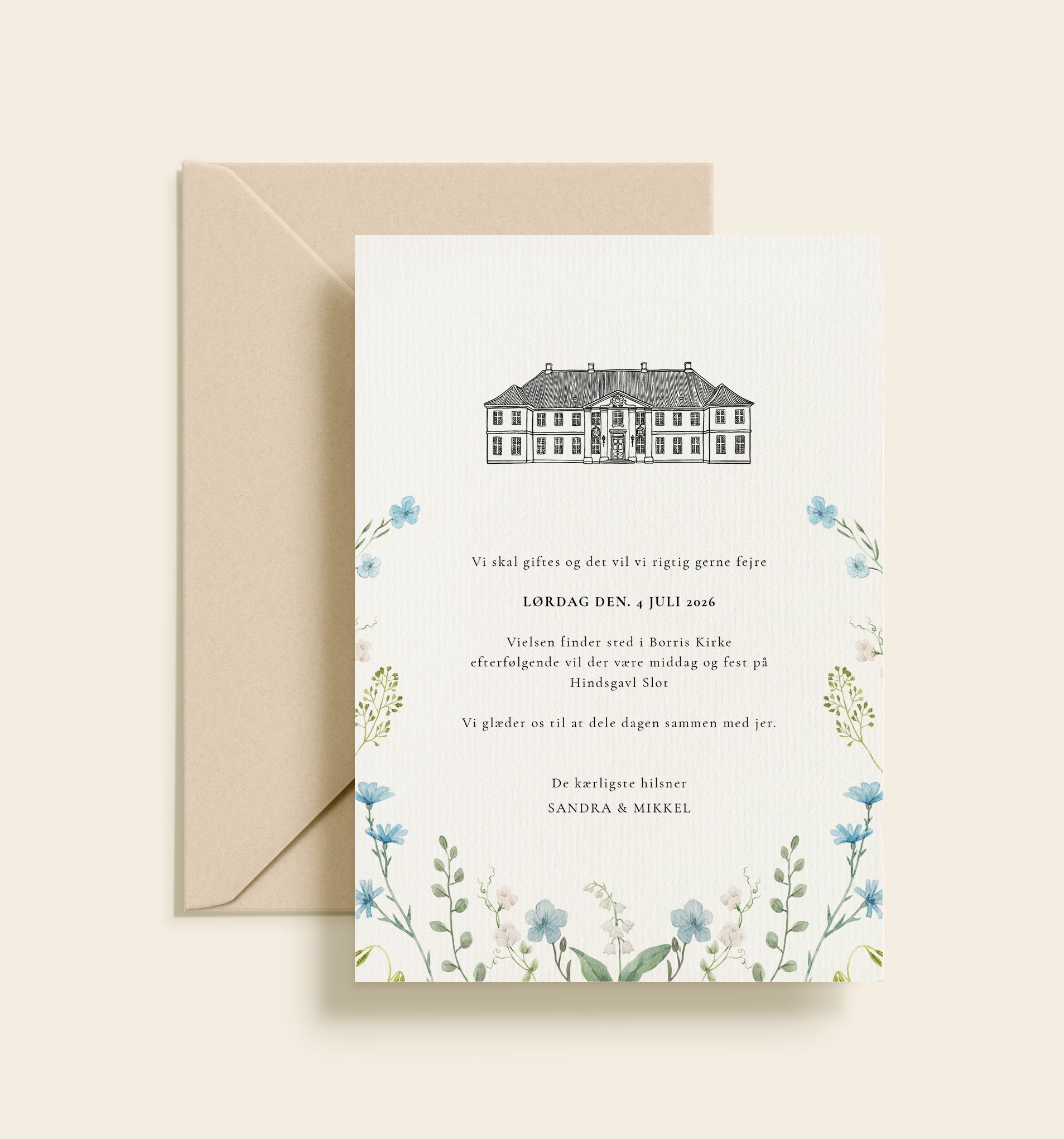 Denne bryllupsinvitation med illustration af Hindsgavl Slot er skabt til jer, der ønsker et tidløst, romantisk og eksklusivt udtryk til jeres store dag. Motivet af det ikoniske slot kombineret med lette blomsterdetaljer giver invitationen et elegant og poetisk præg, der passer perfekt til både slotsbryllupper og klassiske danske vielser.