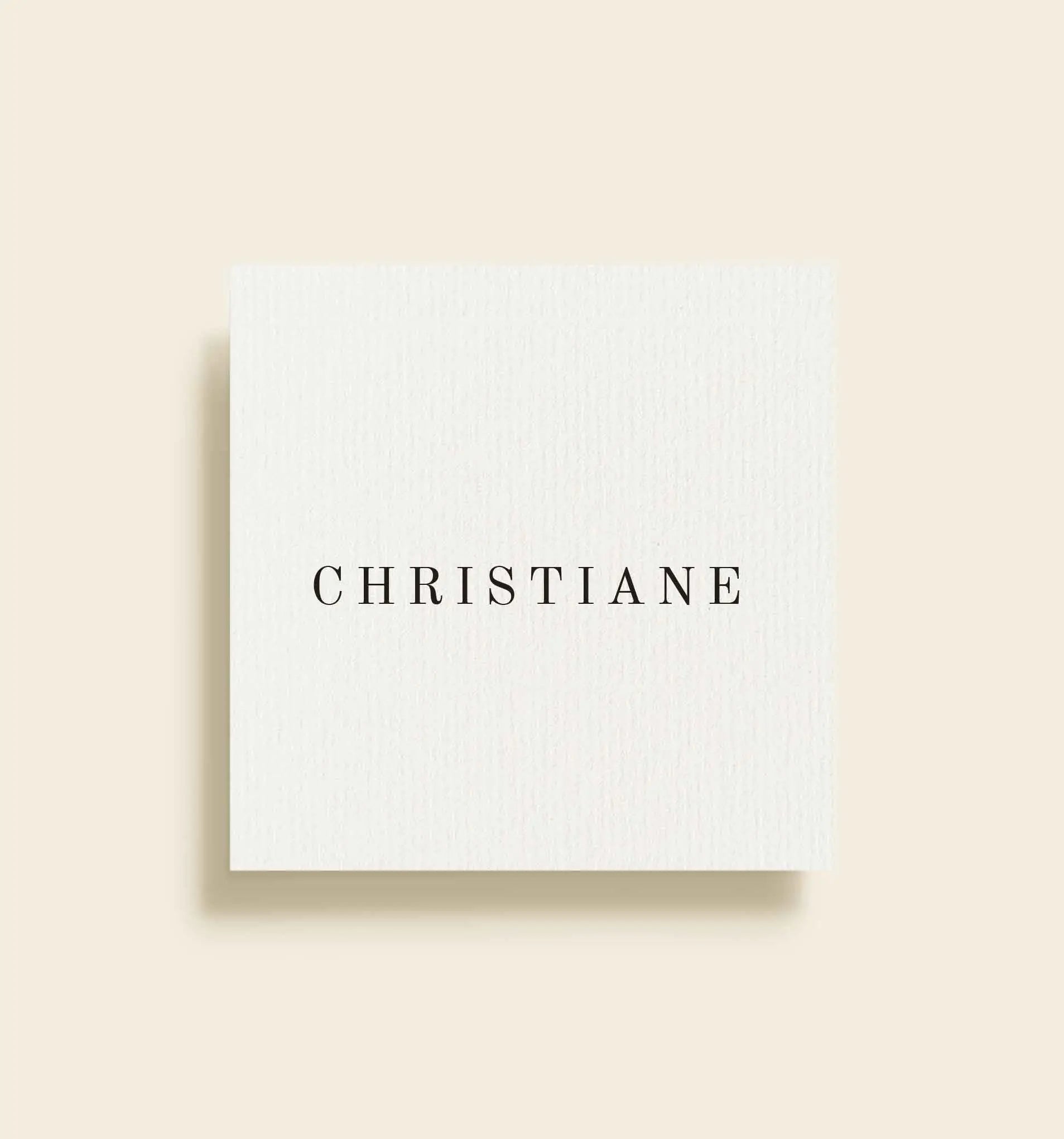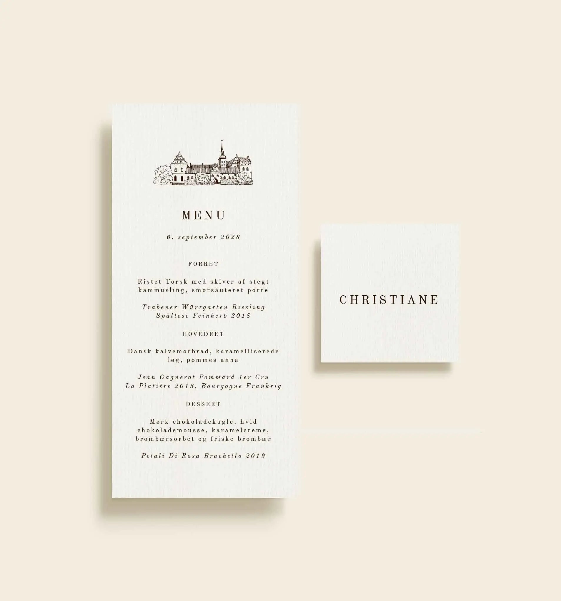 Eksklusivt bordkort fra Holckenhavn Slot bryllupsserien med et klassisk og elegant udtryk, sammensat med en raffineret typografi. Det minimalistiske design fremhæver gæstens navn og skaber en stilfuld og tidløs borddækning.