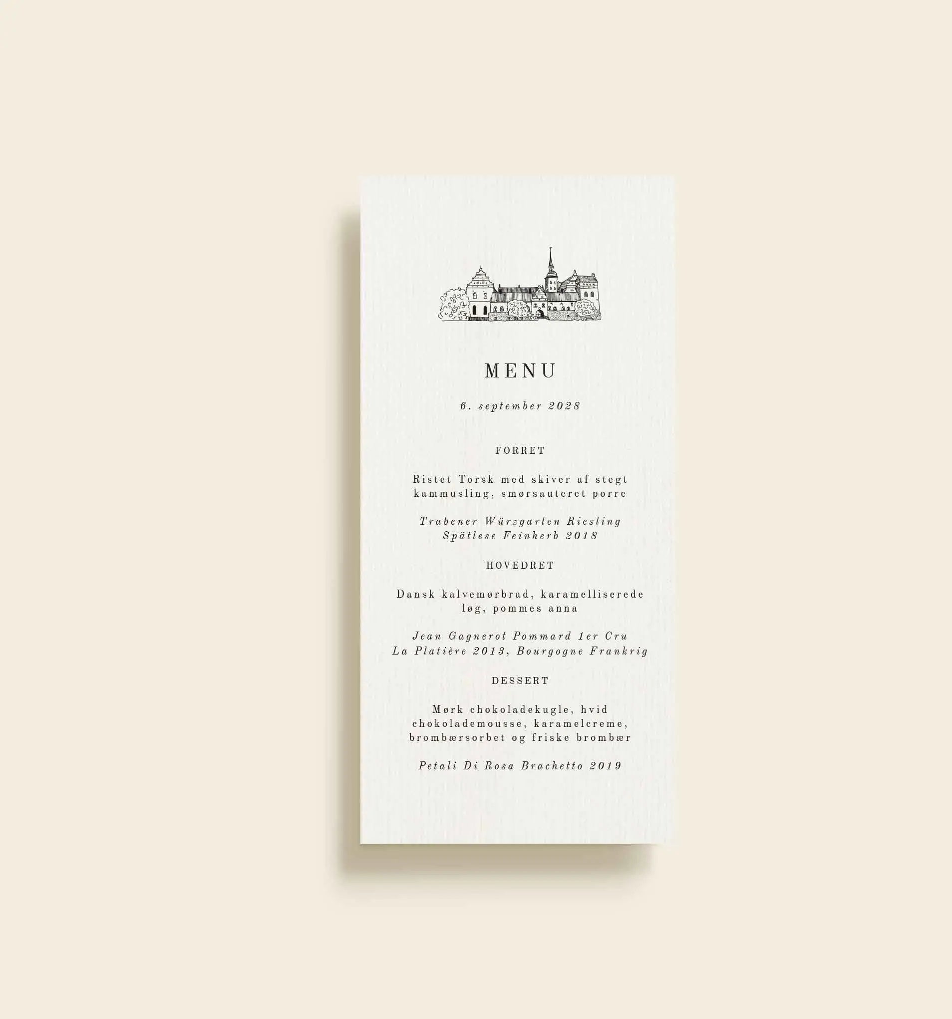 Dette menukort fra Holckenhavn Slot bryllupsserien er designet med inspiration fra herskabelige omgivelser og klassisk elegance. Kortet har en lys, let struktureret baggrund, som giver en eksklusiv og raffineret følelse, mens den detaljerede illustration øverst tilfører et diskret og stemningsfuldt præg.