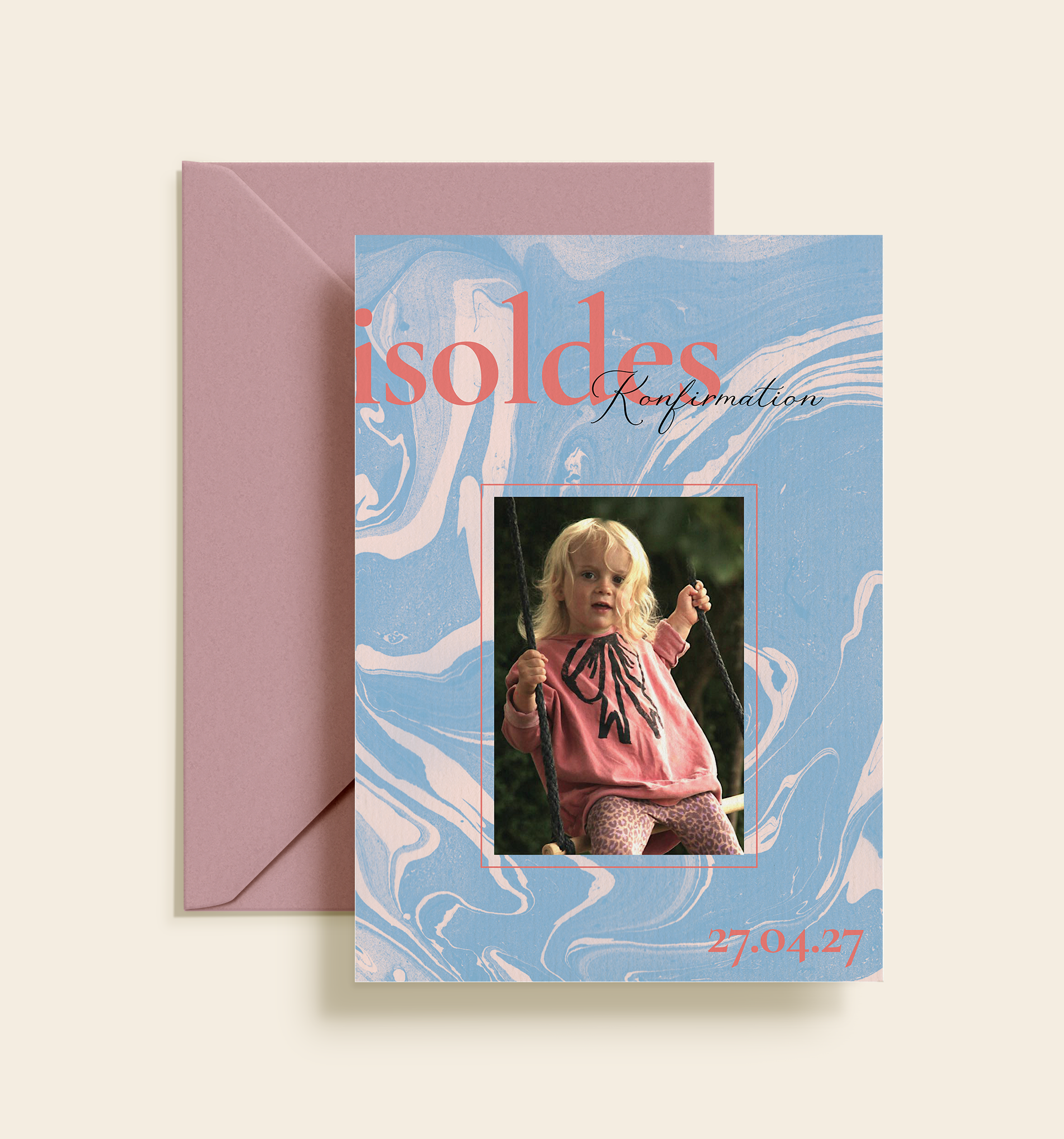 Kreativ konfirmationsinvitation med personligt foto, marmoreret baggrund og moderne typografi. Et farverigt og unikt design, der sætter konfirmanden i centrum.