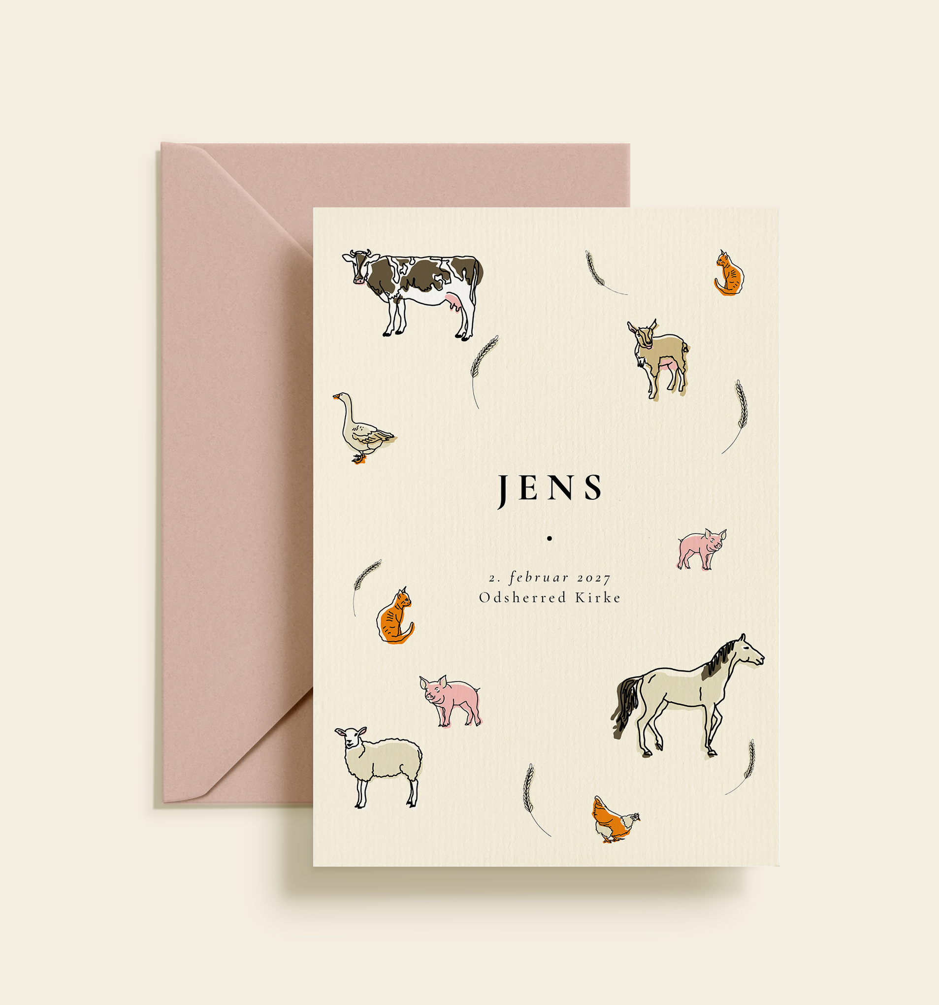 En charmerende barnedåbsinvitation med håndtegnede bondegårdsdyr i bløde, naturlige farver. Et hyggeligt og tidløst design, perfekt til en personlig barnedåb.