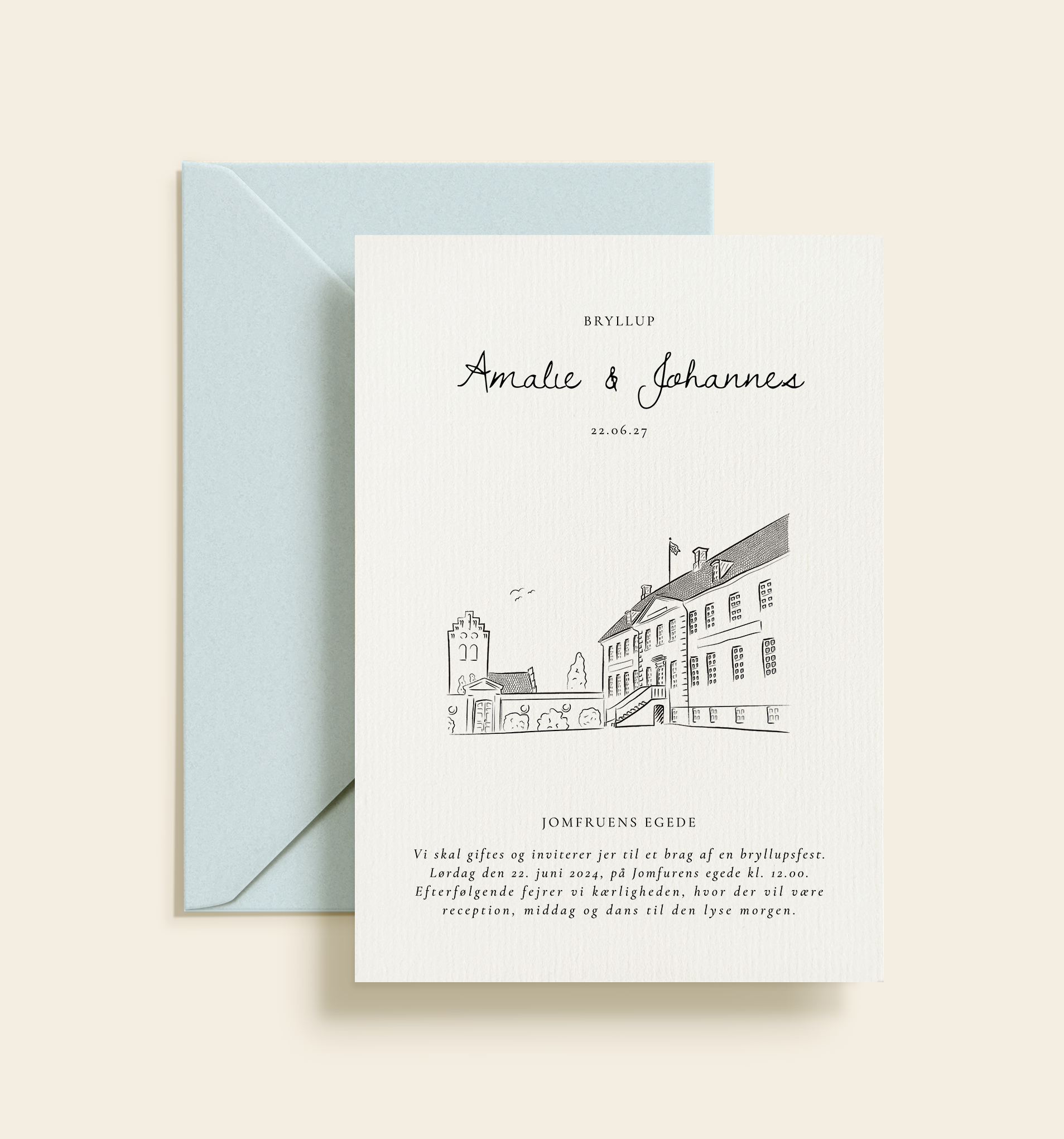 Elegant bryllupsinvitation med håndtegnet illustration af Jomfruens Egede – et klassisk og romantisk design til et stemningsfuldt bryllup i herskabelige omgivelser.
