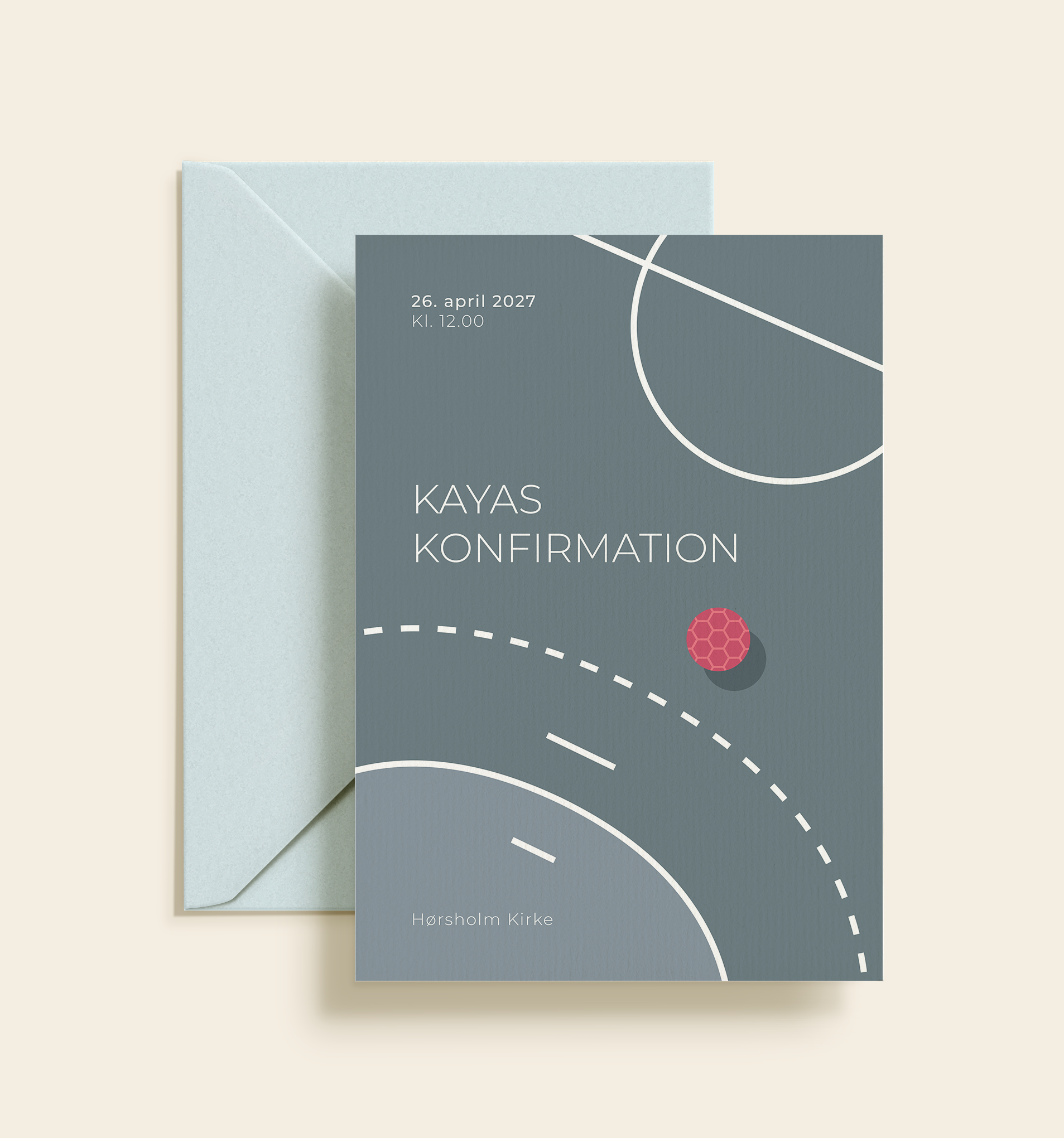 Moderne konfirmationsinvitation med grafisk håndboldinspiration, rene linjer og afdæmpede farver. Et stilrent og sporty design med et personligt og nutidigt udtryk.