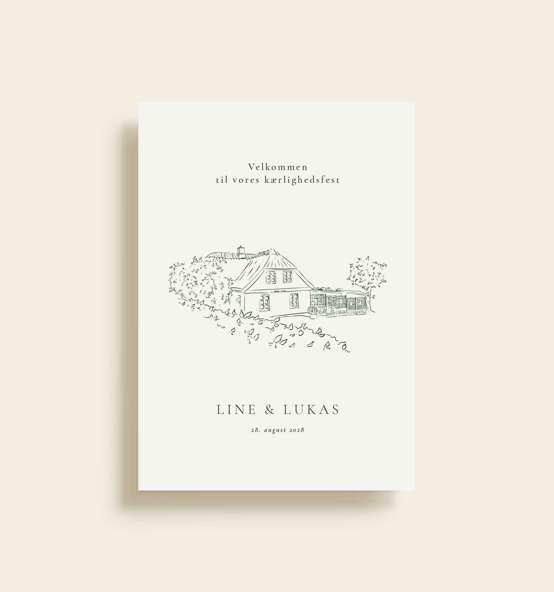 En rolig og stemningsfuld velkomst tager form med dette velkomstskilt fra Kongekilden bryllup kollektionen. Den enkle venue stregillustration af den idylliske bygning tilfører designet karakter og skaber en smuk forbindelse til brylluppets omgivelser. Samtidig giver det minimalistiske layout masser af luft, så både illustration og tekst fremstår tydeligt og elegant.