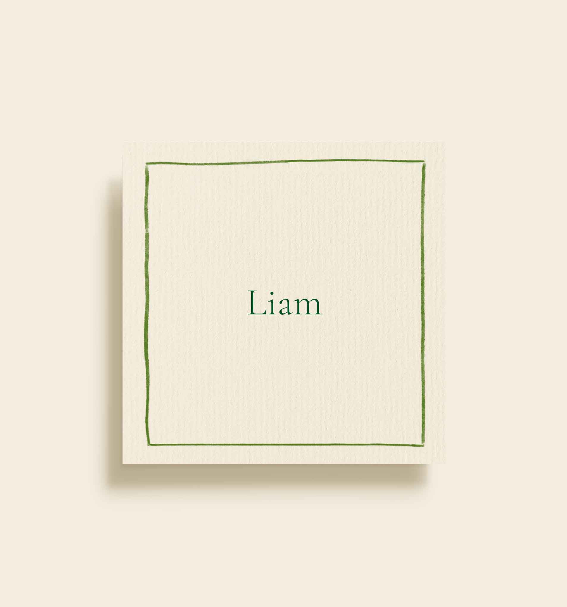 Dette bordkort er designet med en fin, håndtegnet grøn ramme, der indrammer navnet på enkel og elegant vis. Det minimalistiske udtryk giver et roligt og harmonisk look, som passer perfekt til både klassiske, naturlige og moderne festtemaer.