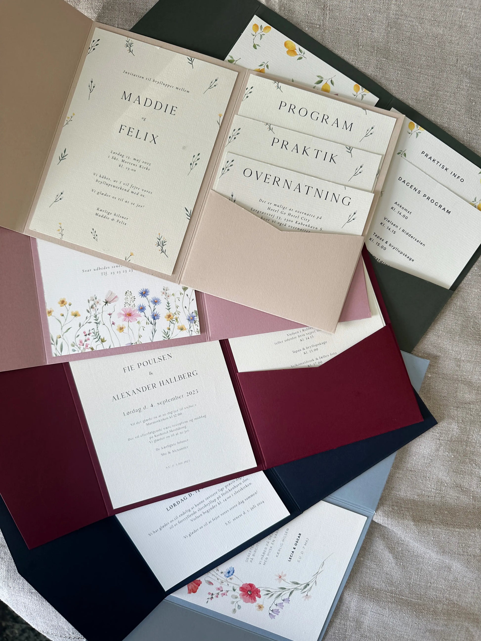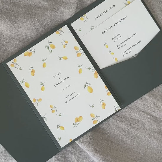 En smuk og praktisk bryllupsinvitation med lommer – også kaldet pocketfold – er en elegant måde at samle flere kort på ét sted. Har I program, praktiske oplysninger, RSVP eller overnatning som separate kort, giver lommekuverten struktur og et eksklusivt udtryk.