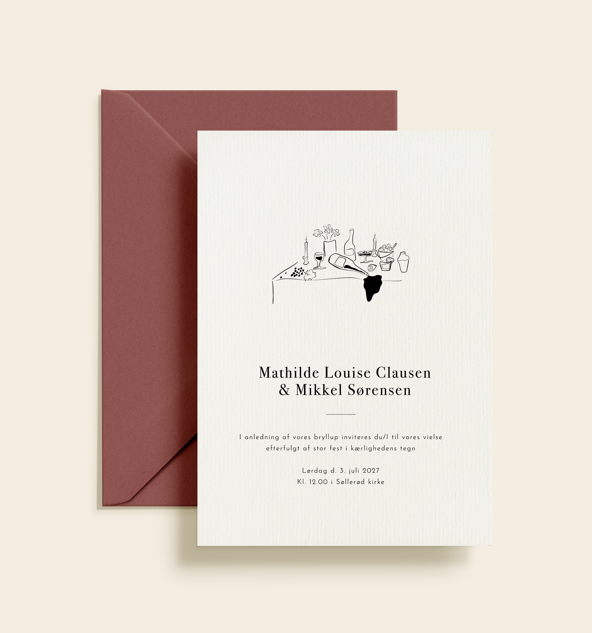 Denne bryllupsinvitation har et let og raffineret udtryk, hvor den håndtegnede stregillustration tilfører designet personlighed og varme. Motivet med det dækkede bord skaber en umiddelbar association til fællesskab, nærvær og fejringen af kærligheden – øjeblikket, hvor man samles omkring noget særligt.