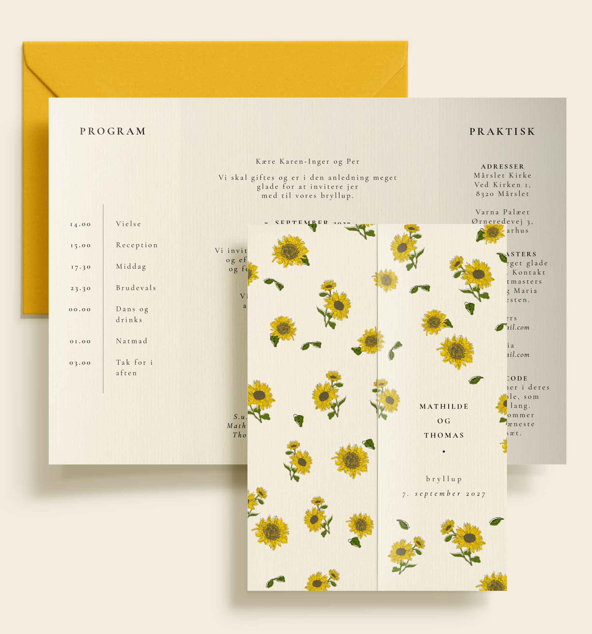 En elegant portfalsinvitation til brylluppet, hvor håndtegnede solsikker skaber et varmt og sommerligt udtryk. Invitationen åbner i tre fløje og rummer både invitationstekst, program og praktisk info, smukt sammensat med en klassisk typografi.
