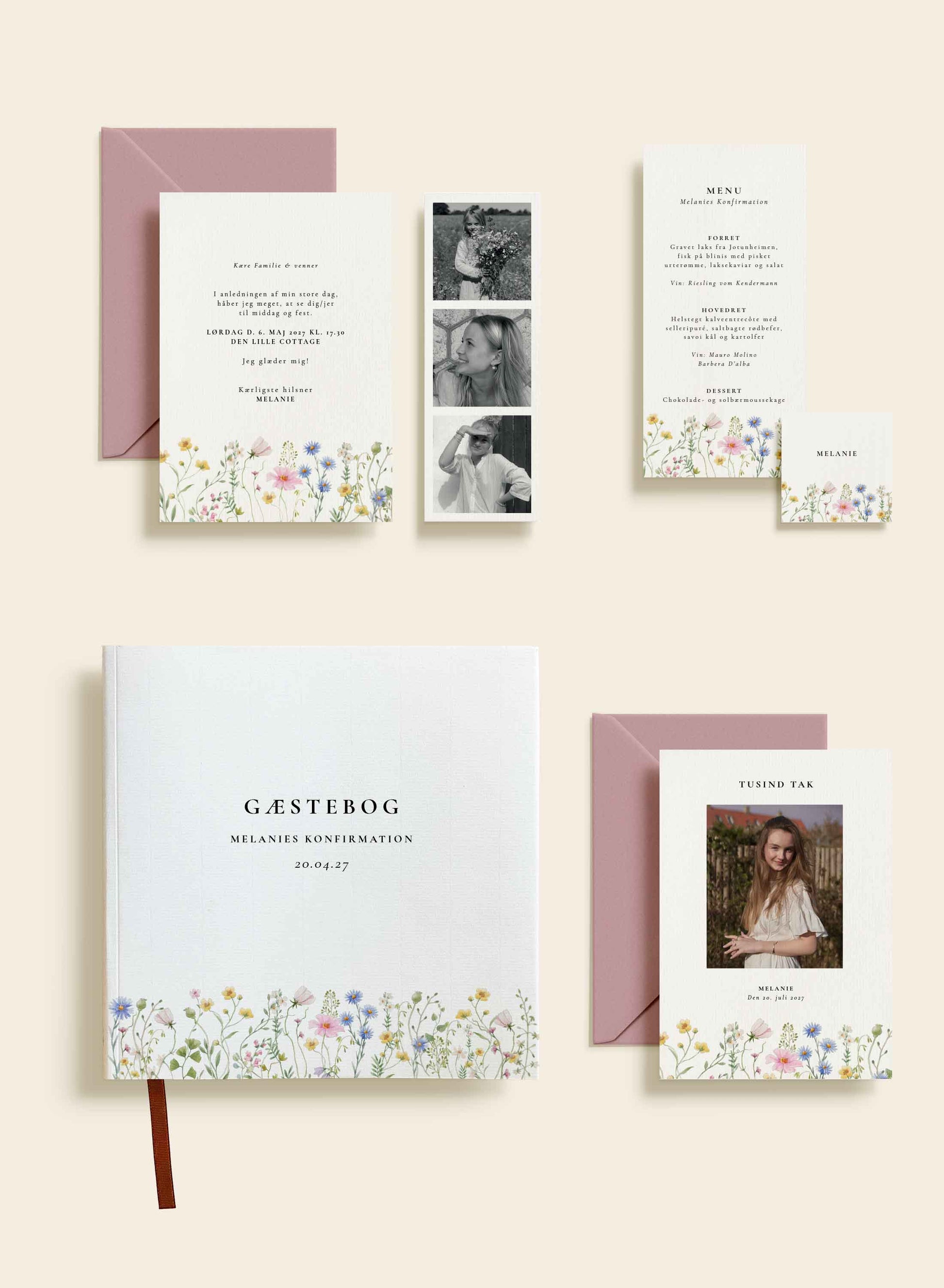 Blomsterillustrationerne tilfører invitationen en rolig og stemningsfuld følelse, der passer perfekt til en festlig og mindeværdig dag. Designet er ideelt til jer, der ønsker en tidløs konfirmationsinvitation med et feminint og poetisk præg – en invitation, der føles både nærværende og eksklusiv.