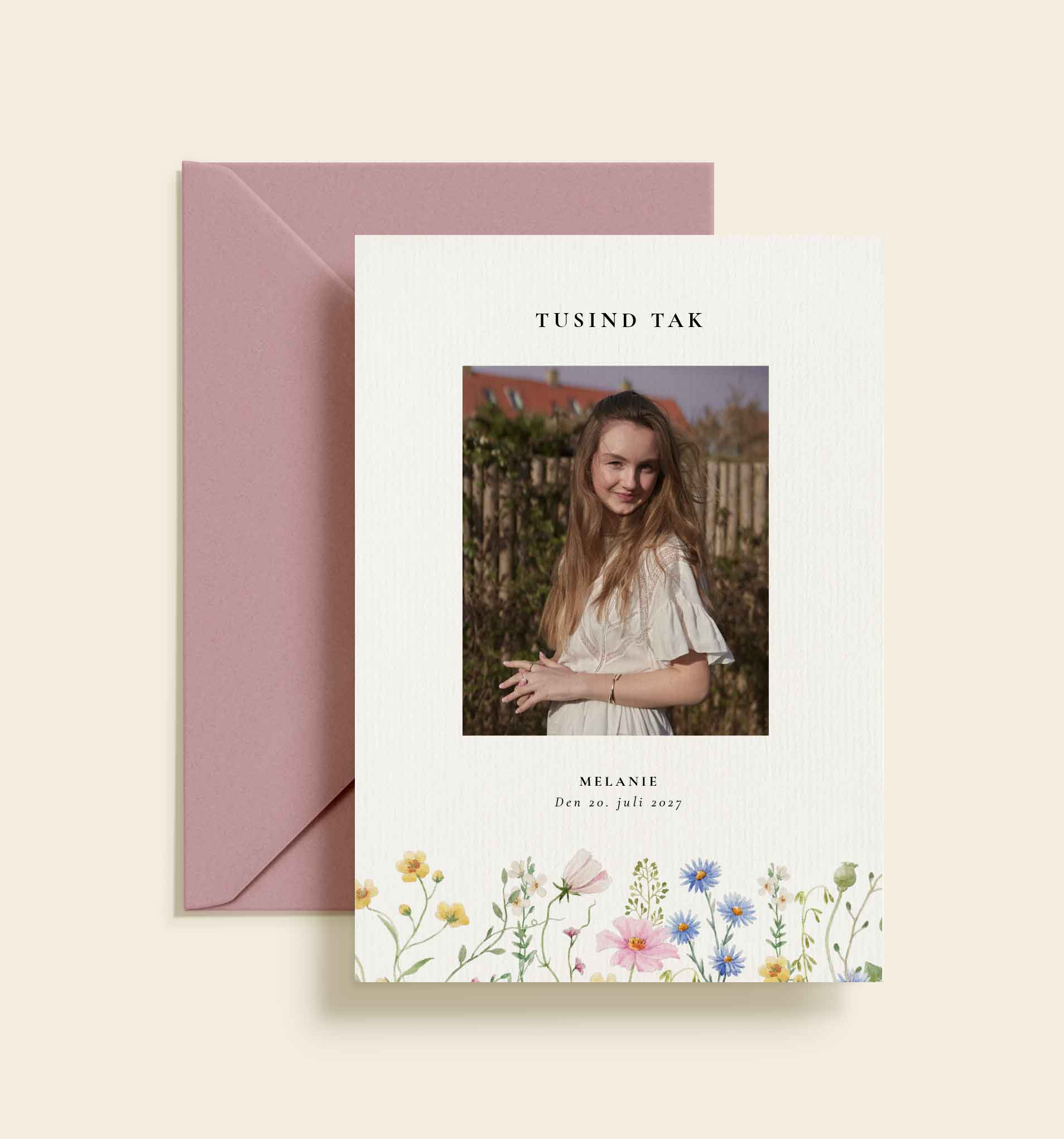 Dette takkekort kombinerer et personligt portrætfoto med fine, håndmalede blomster i bløde og naturlige nuancer. Designet har et let og elegant udtryk, der passer perfekt til en særlig dag og giver modtageren en varm og personlig hilsen.