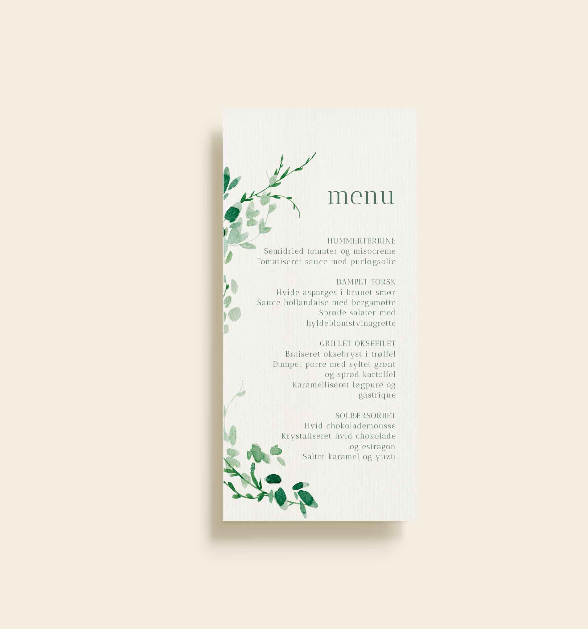 Elegant menukort med botanisk illustration i grønne nuancer.