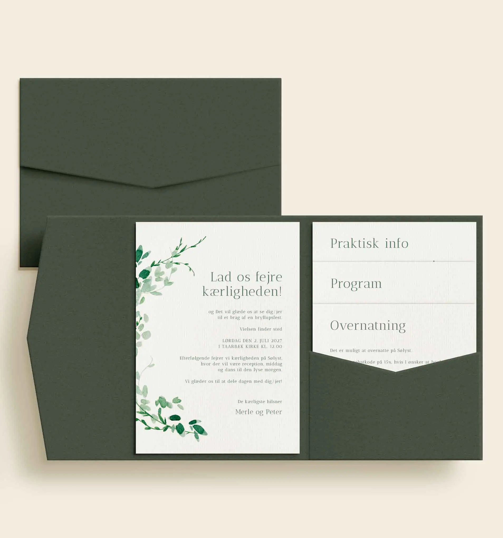Elegant lommekuvert i en dyb, støvet grøn nuance, der samler hele bryllupsinvitationen i én harmonisk løsning. Invitationen placeres til venstre, mens op til tre tillægskort ligger samlet i lommen til højre. Designet prydes af fine, akvarelmalede grønne grene, som skaber et naturligt og romantisk udtryk, sammensat med en let og elegant typografi, der giver et tidløst og stilrent helhedsindtryk.
