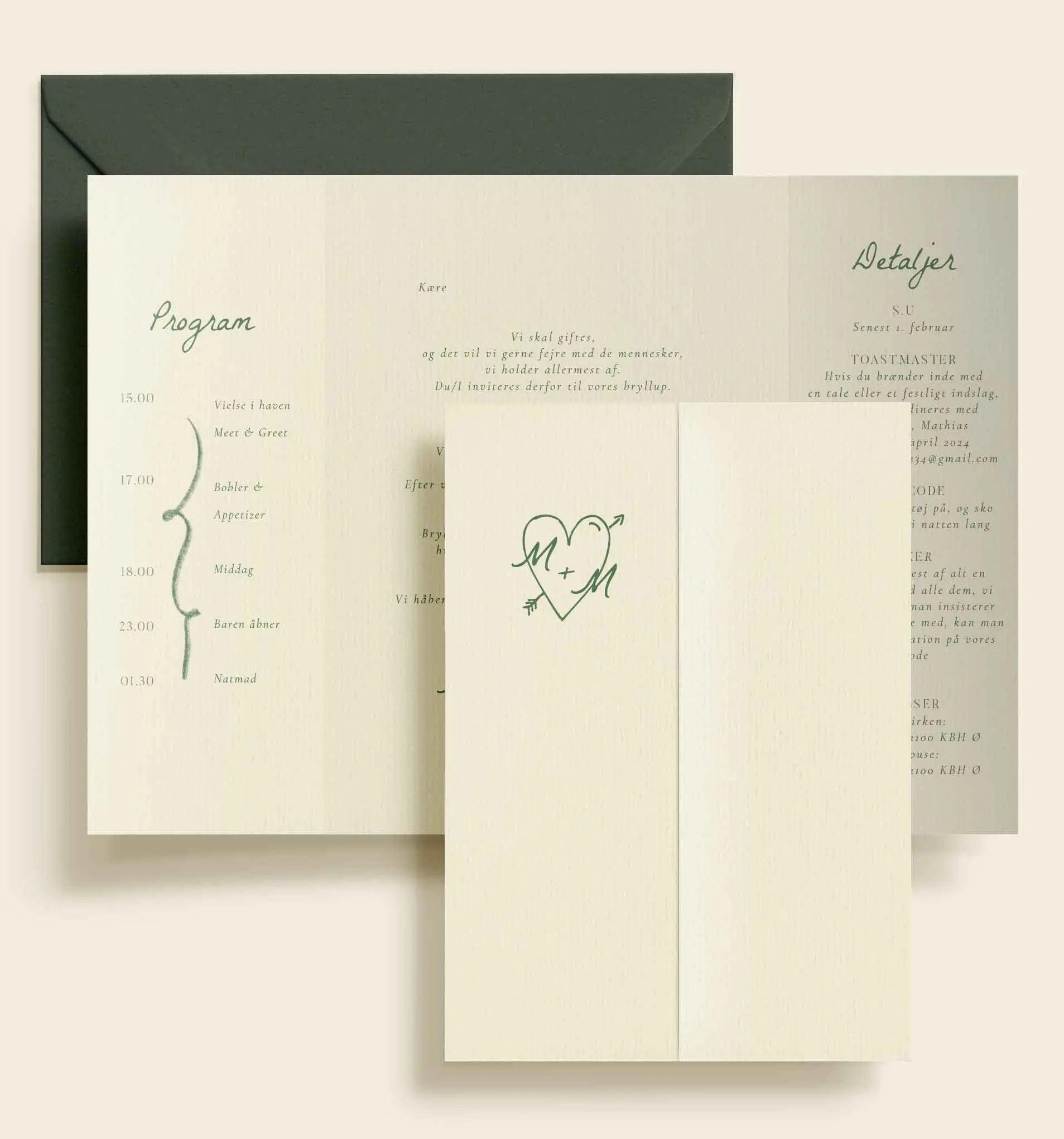 Dette portfals til bryllup kombinerer minimalistisk design med en personlig detalje i form af et enkelt, illustreret monogram på forsiden. Hjertet med initialer giver invitationen et romantisk og legende præg, mens den lyse, varme papirbund tilfører eksklusivitet og ro. Indvendigt er program og detaljer sat op i en luftig og overskuelig struktur, hvor grønne nuancer går igen og binder designet smukt sammen.