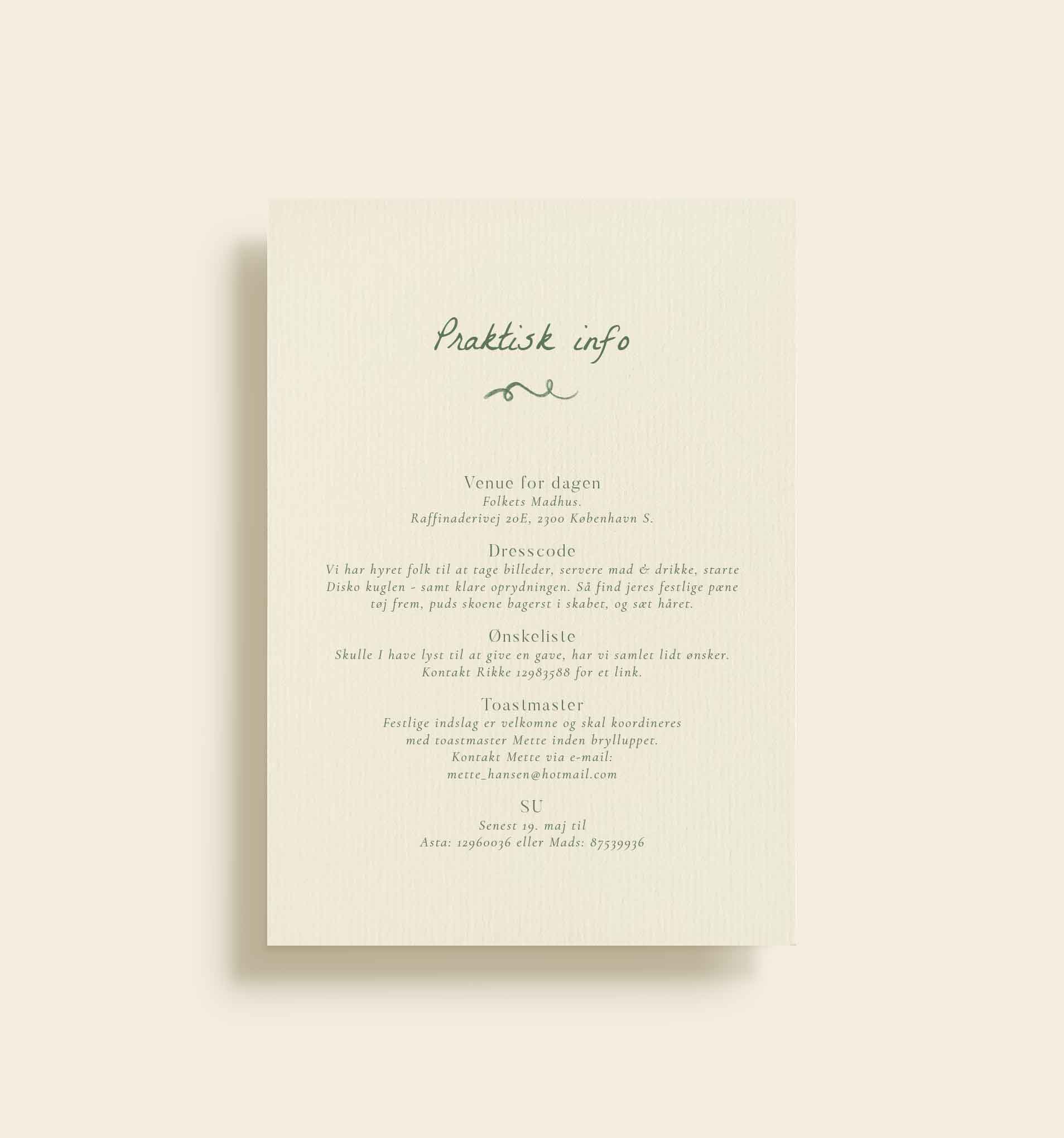 Dette tillægskort med praktisk info er et smukt supplement til bryllupsinvitationen og skabt til at samle dagens vigtigste oplysninger ét sted. Her er plads til venue, dresscode, toastmaster, ønskeliste og S.U. – formidlet i et roligt og indbydende design, der er let at læse for gæsterne.