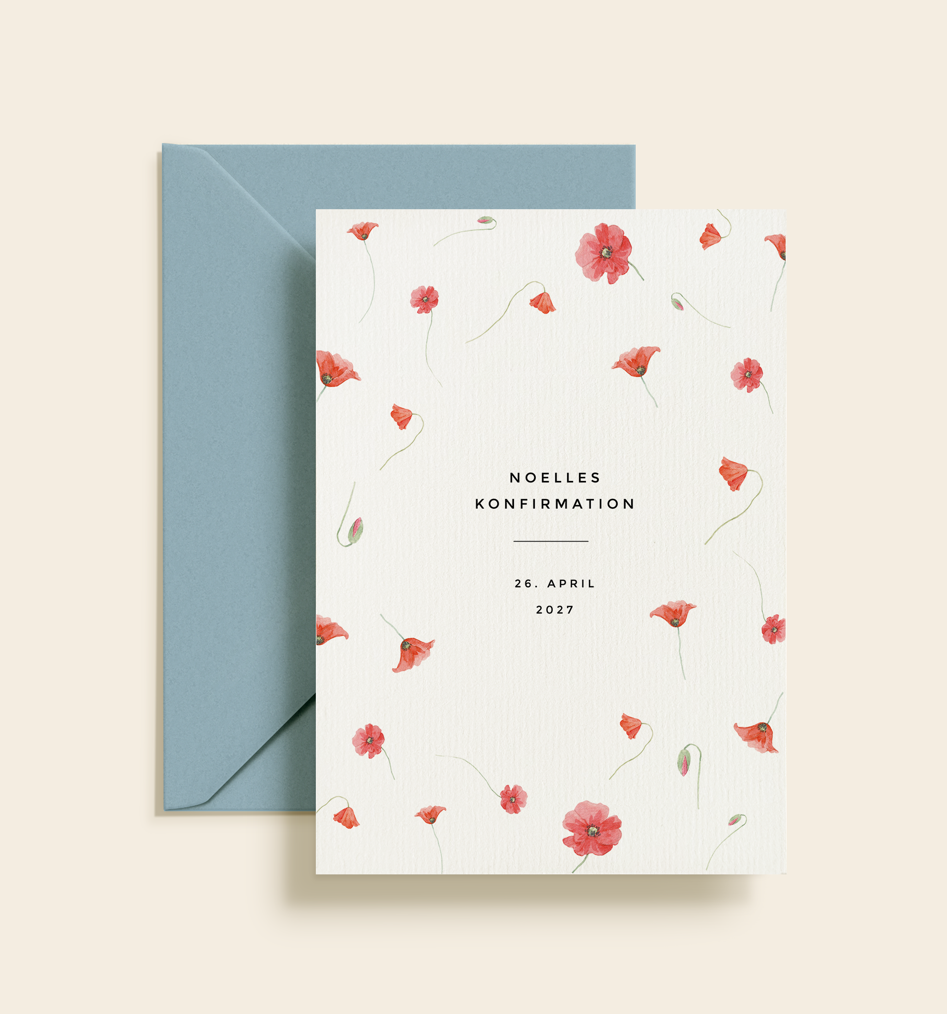 Dette konfirmationskort har et let og romantisk udtryk, dekoreret med fine håndmalede valmuer i bløde røde og rosa nuancer. De delikate blomsterillustrationer er spredt let over kortets overflade og skaber en luftig og harmonisk helhed, der føles både moderne og tidløs.