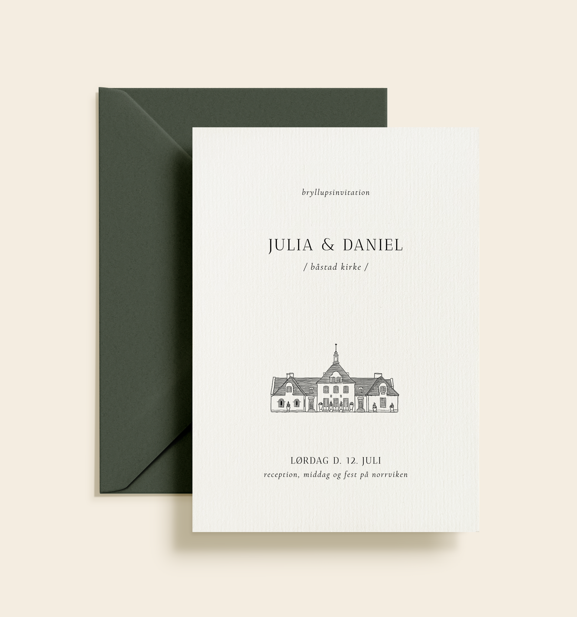 Elegant bryllupsinvitation med håndtegnet illustration af Norrviken. Et tidløst og harmonisk design med klassisk typografi og et roligt, eksklusivt udtryk.