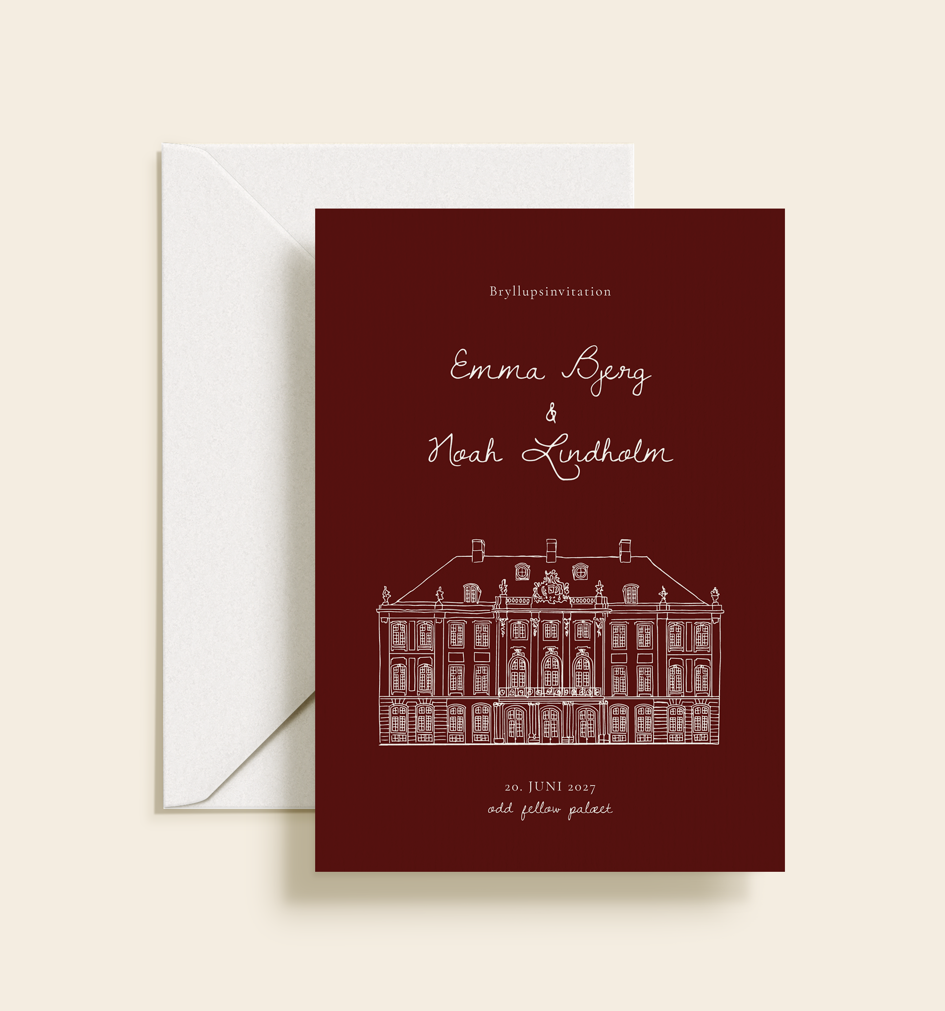 Denne bryllupsinvitation er designet med en smuk, håndtegnet illustration af Odd Fellow Palæet, som danner rammen om et sofistikeret og stemningsmættet udtryk. Den dybe bordeauxfarve giver invitationen en luksuriøs karakter og skaber en tydelig fornemmelse af aften, elegance og højtidelig fest.