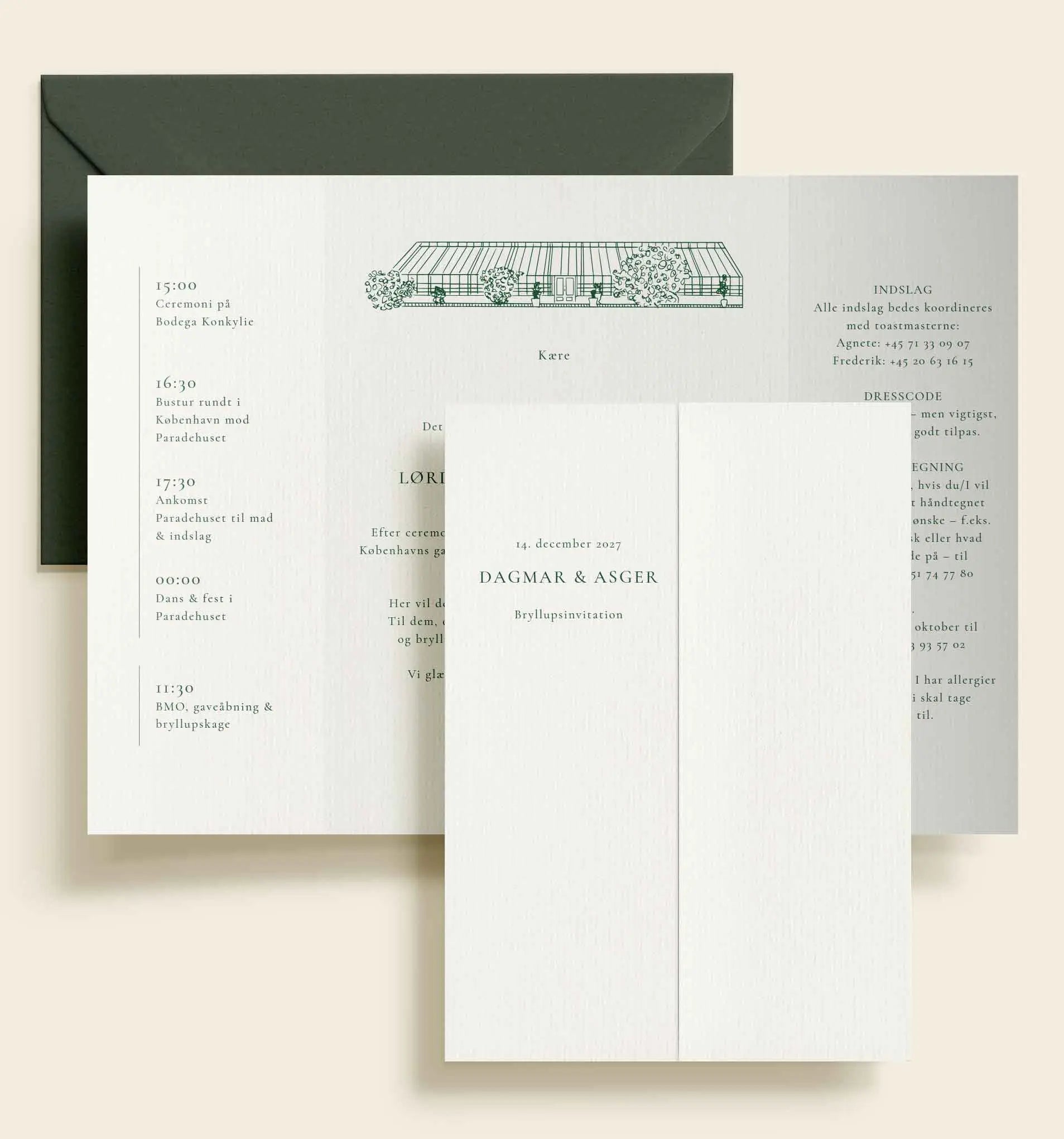 Den gennemgående grønne farve binder designet smukt sammen og understreger den klassiske og tidløse stil, sammensat med en velafbalanceret typografi, der giver invitationen et elegant og moderne udtryk – perfekt til et bryllup i stemningsfulde og historiske rammer.