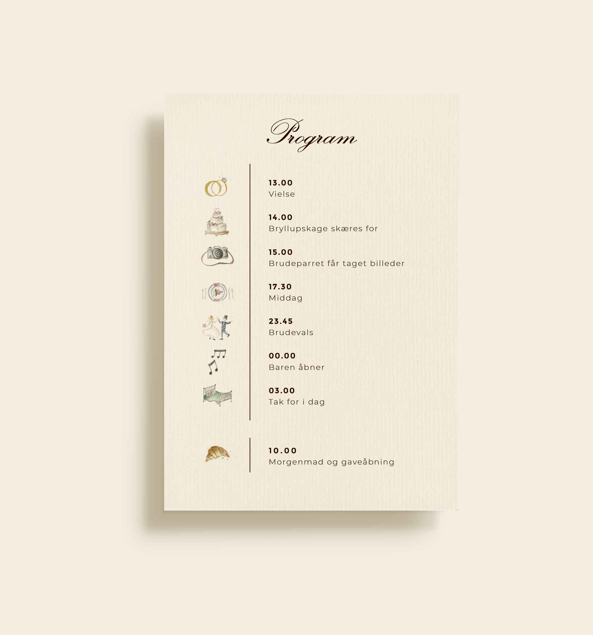 Designet er holdt i et let og elegant udtryk, hvor de fine ikoner – som ringe, kirker og andre bryllupsillustrationer – gør indholdet mere visuelt og nemt at aflæse. Tillægskortene kan tilpasses i forskellige former og størrelser, så de passer præcist til jeres invitation og behov.