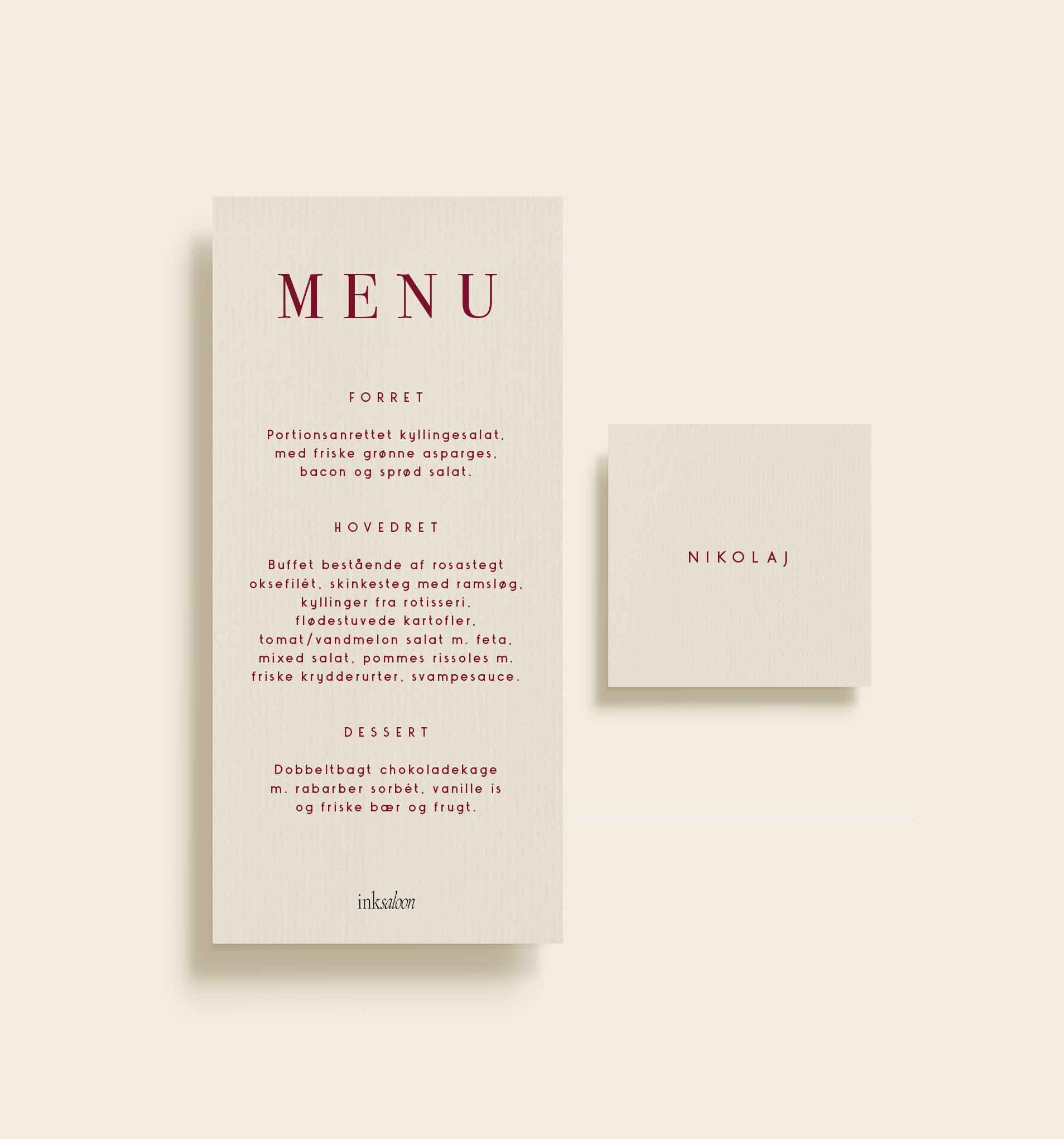 Menukortet trykkes på kraftigt kvalitetspapir med let struktur, hvilket understreger det eksklusive udtryk og giver en behagelig, sanselig fornemmelse. Det enkle design sikrer, at menukortet ikke tager fokus fra bordets øvrige elementer, men i stedet binder helheden elegant sammen.