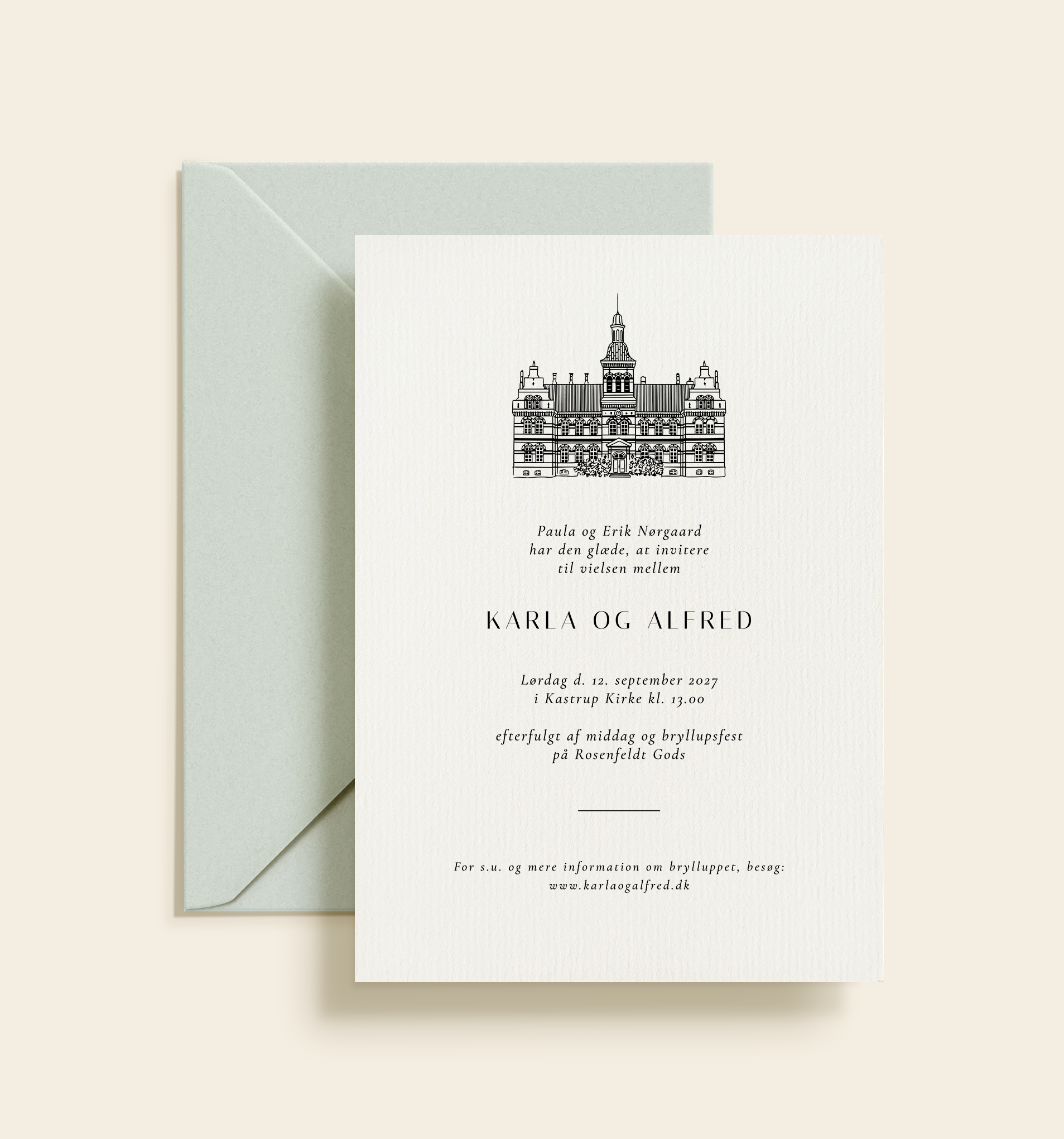 Denne bryllupsinvitation er designet med fokus på klassisk elegance og smukke, arkitektoniske detaljer. Den håndtegnede illustration af Rosenfeldt Gods giver invitationen et eksklusivt og personligt udtryk, som gør den ideel til bryllupper i de herskabelige og historiske rammer, stedet er kendt for.