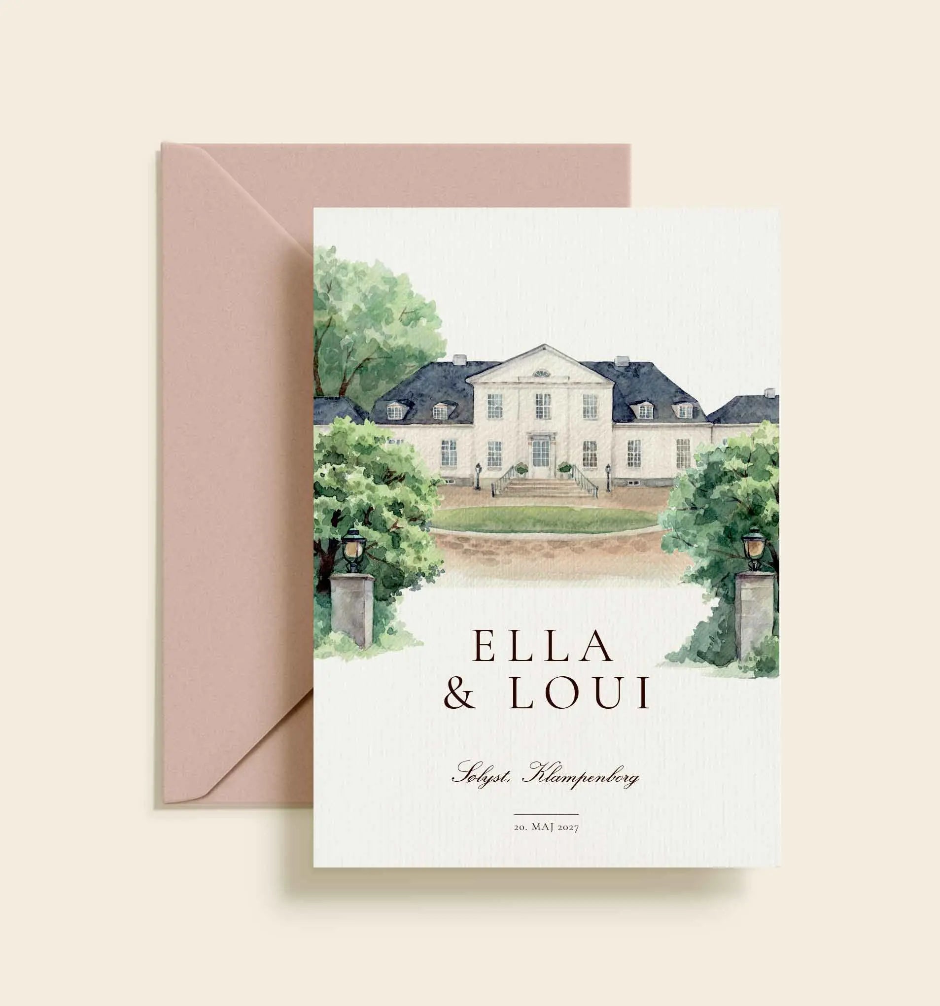 Denne bryllupsinvitation med akvarelillustration af Sølyst er skabt til par, der ønsker et romantisk og elegant design til deres bryllup i de smukke omgivelser ved Klampenborg. Invitationens øverste del prydes af en detaljeret akvarelillustration af indgangen til Sølyst, hvor de grønne træer, de klassiske lamper og den smukke hovedbygning skaber en indbydende og stemningsfuld scene. Illustrationen tilfører invitationen et kunstnerisk og eksklusivt præg, som giver gæsterne en fornemmelse af bryllupsstedets atmosfære allerede ved modtagelsen af invitationen. Under illustrationen står brudeparrets navne centralt placeret i en klassisk serif, sammensat med en elegant typografi der skaber en smuk balance mellem romantik og stilren enkelhed. Designet er holdt i lyse og naturlige farver, der understøtter det elegante og tidløse udtryk og passer perfekt til bryllupper på Sølyst. Invitationen fungerer både som en smuk introduktion til brylluppet og som et minde om dagen i de historiske omgivelser ved Øresund. Det er en ideel bryllupsinvitation til par, der holder bryllup på Sølyst og ønsker et design, der afspejler stedets klassiske arkitektur, natur og romantiske stemning.