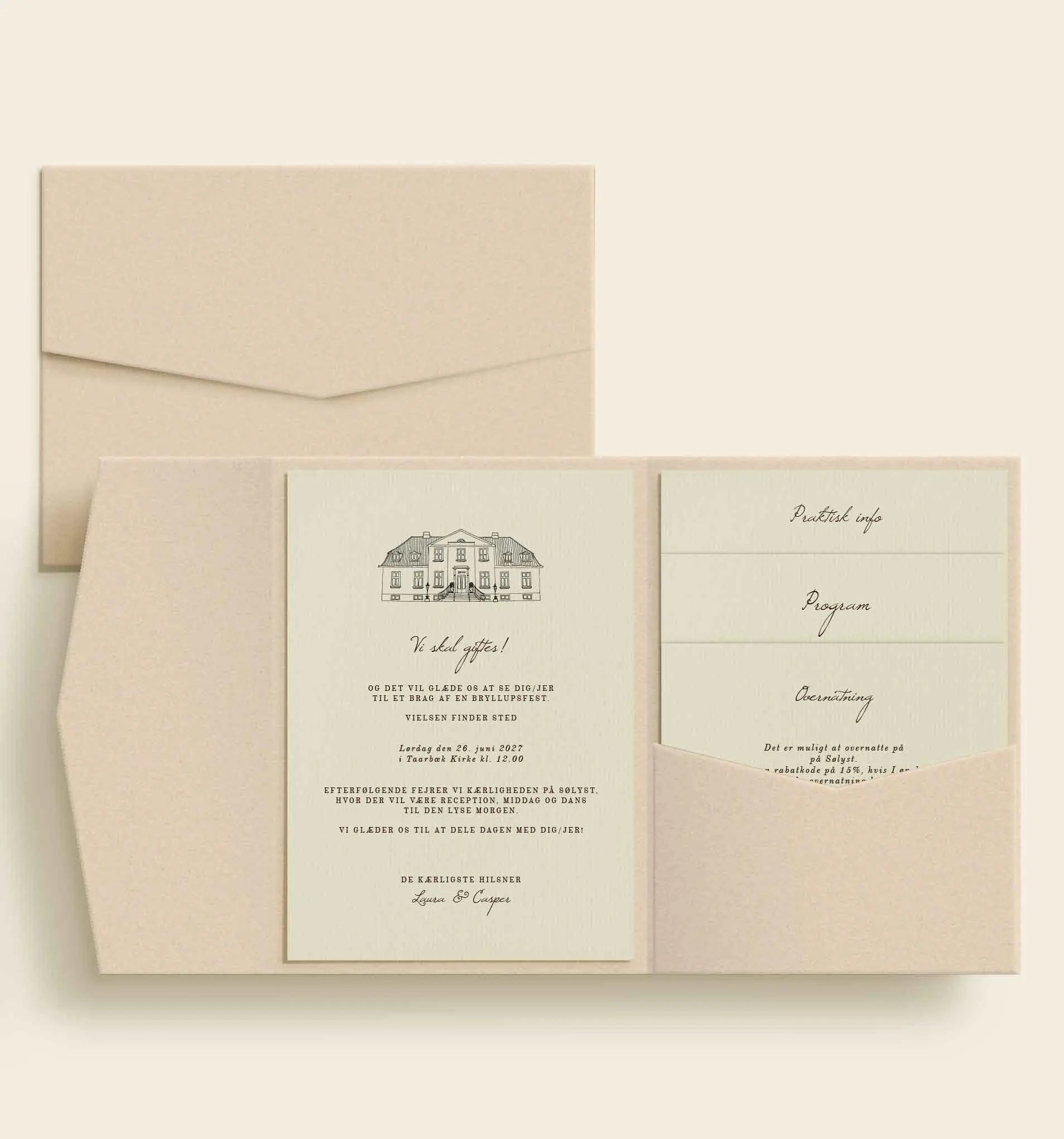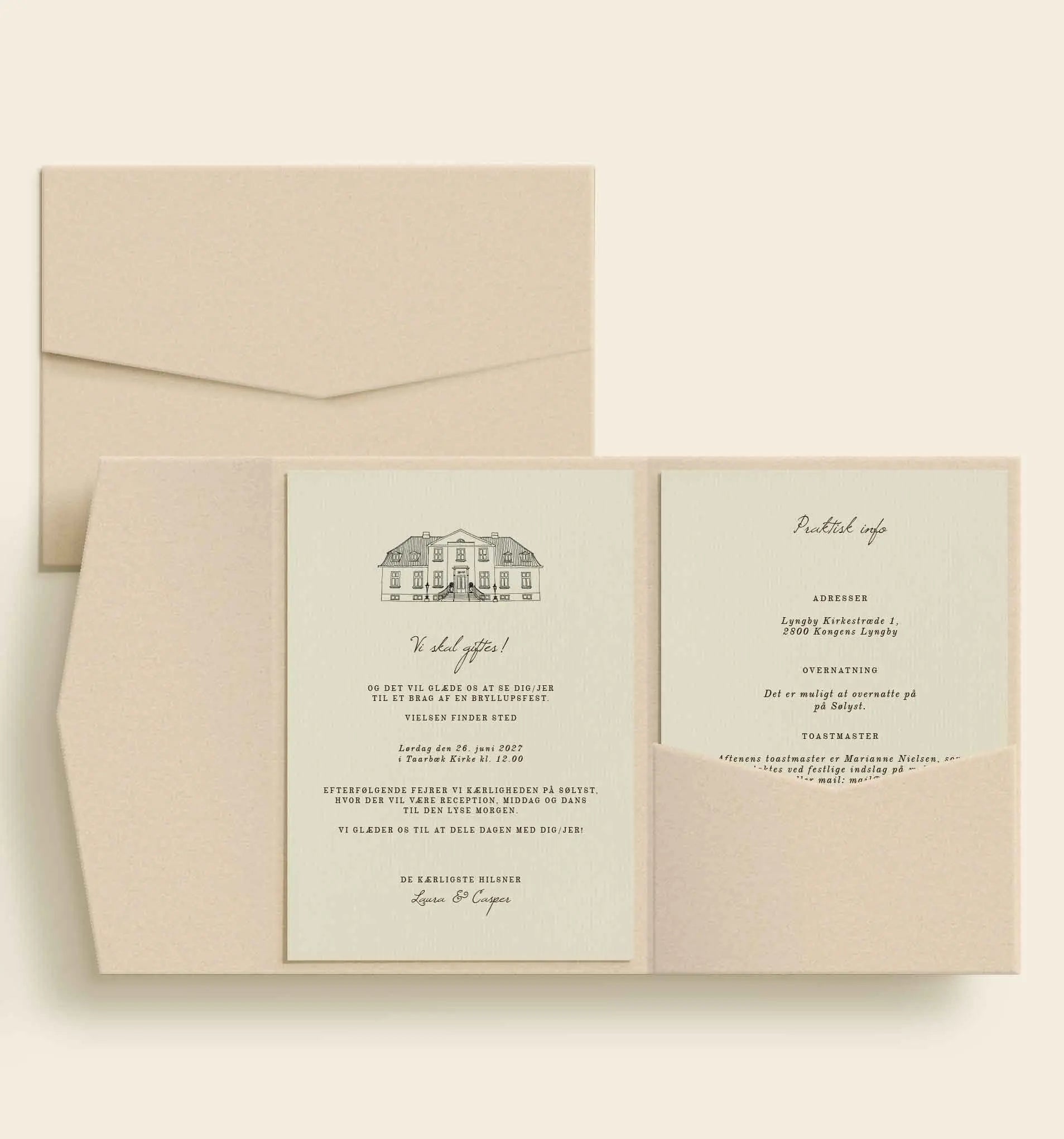 Elegant lommekuvert i en varm, beige nuance, der samler hele bryllupsinvitationen i én harmonisk helhed. Invitationen placeres til venstre, mens op til tre tillægskort ligger samlet i lommen til højre. Designet er klassisk og raffineret med en fin illustration af herskabsbygningen øverst, sammensat med en elegant og let typografi, der skaber et tidløst og romantisk udtryk.