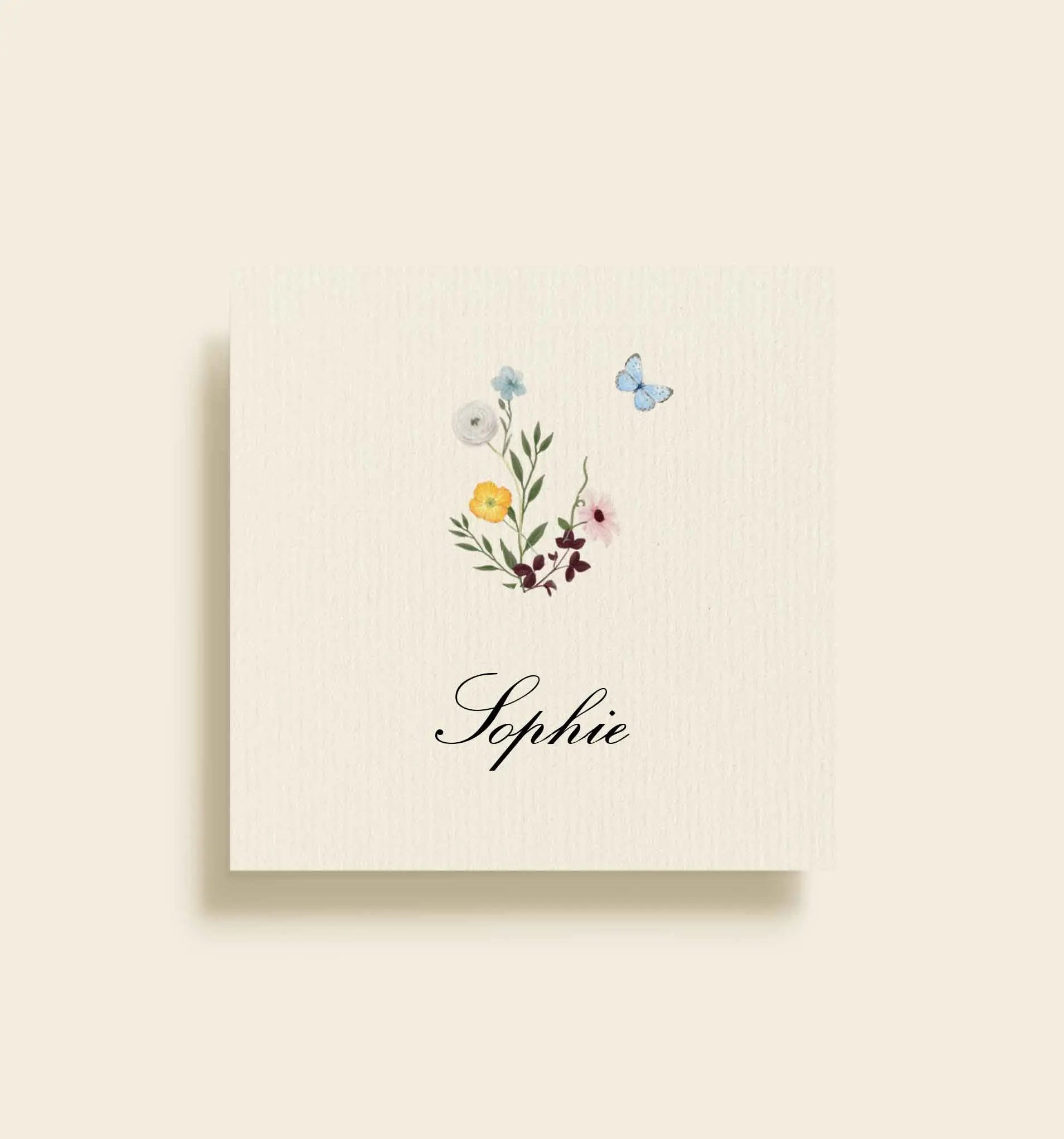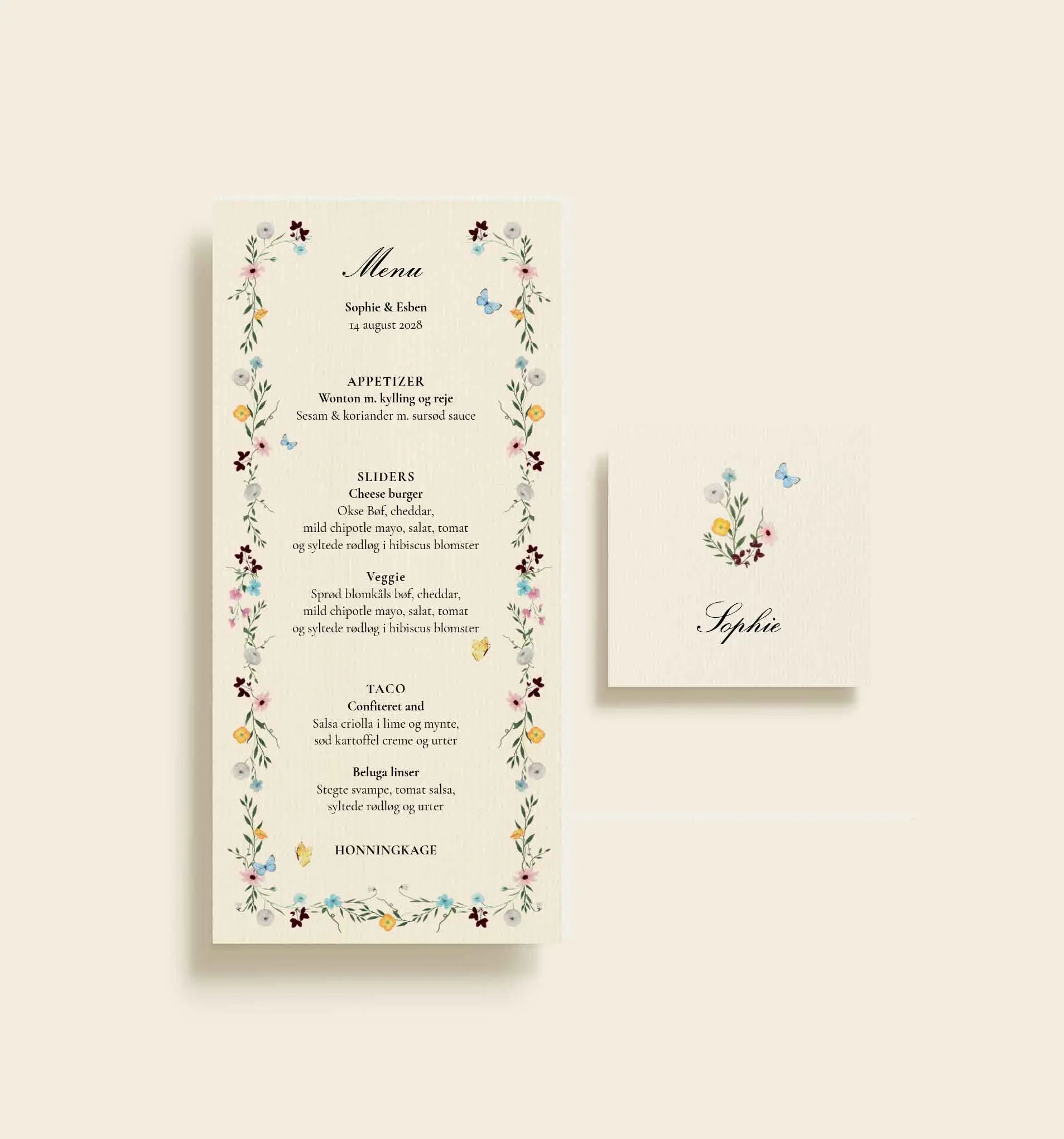 Dette bordkort fra Sophie & Esben bryllupsserien er designet til at tilføre jeres borddækning et romantisk og elegant udtryk. Kortet har en lys, let struktureret baggrund, som giver en eksklusiv følelse, mens de små, håndtegnede blomster og den fine sommerfugl tilfører et let og poetisk præg.