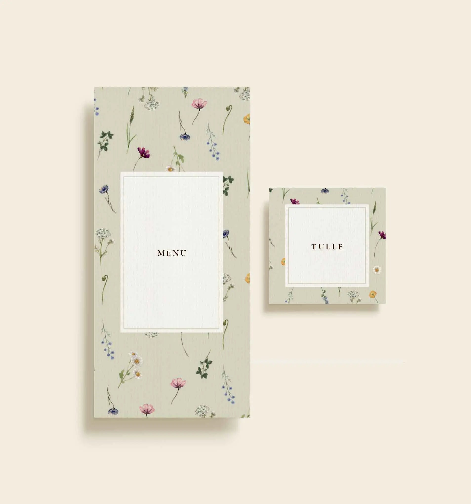 Dette bordkort fra Tulle & Tim bryllupsserien er designet til at skabe en romantisk og stemningsfuld borddækning. Kortet har en lys, let struktureret baggrund, som giver en eksklusiv følelse, mens de håndtegnede blomsterillustrationer smukt indrammer midten og tilfører et naturligt og elegant præg.