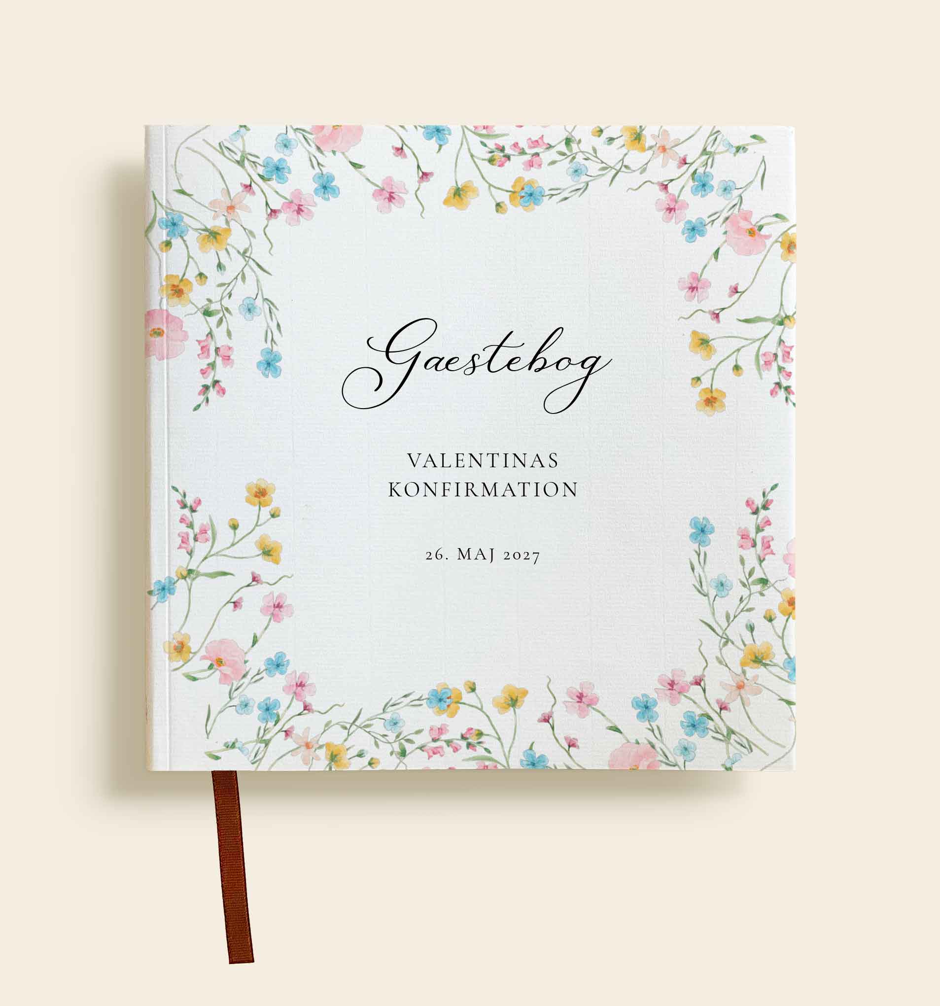 Romantisk gæstebog til konfirmation med farverige blomster og personlig tekst.