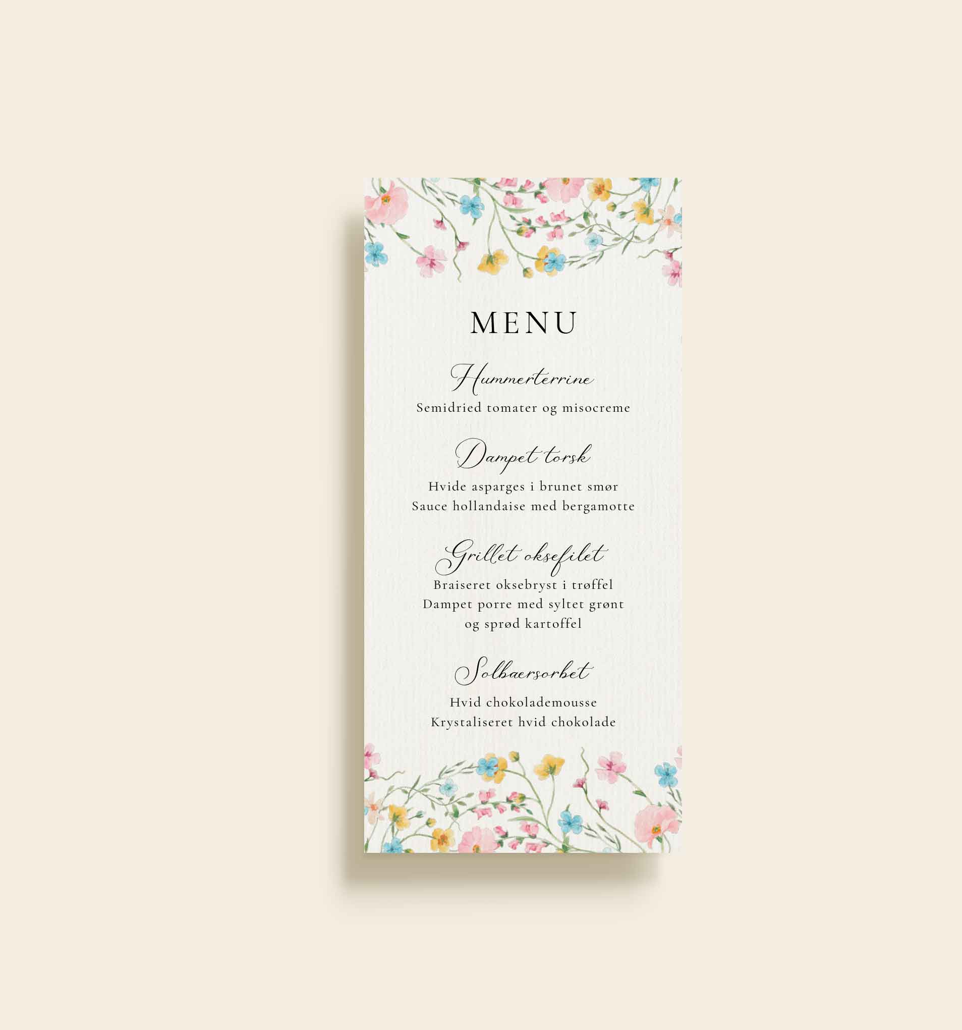 Dette elegante menukort er designet med et smukt, romantisk blomsterunivers, der indrammer menuen både foroven og forneden. De håndmalede blomster i bløde pastelfarver skaber et let og poetisk udtryk, som passer perfekt til bryllupper, sommerfester og andre særlige anledninger, hvor detaljerne må være noget særligt.