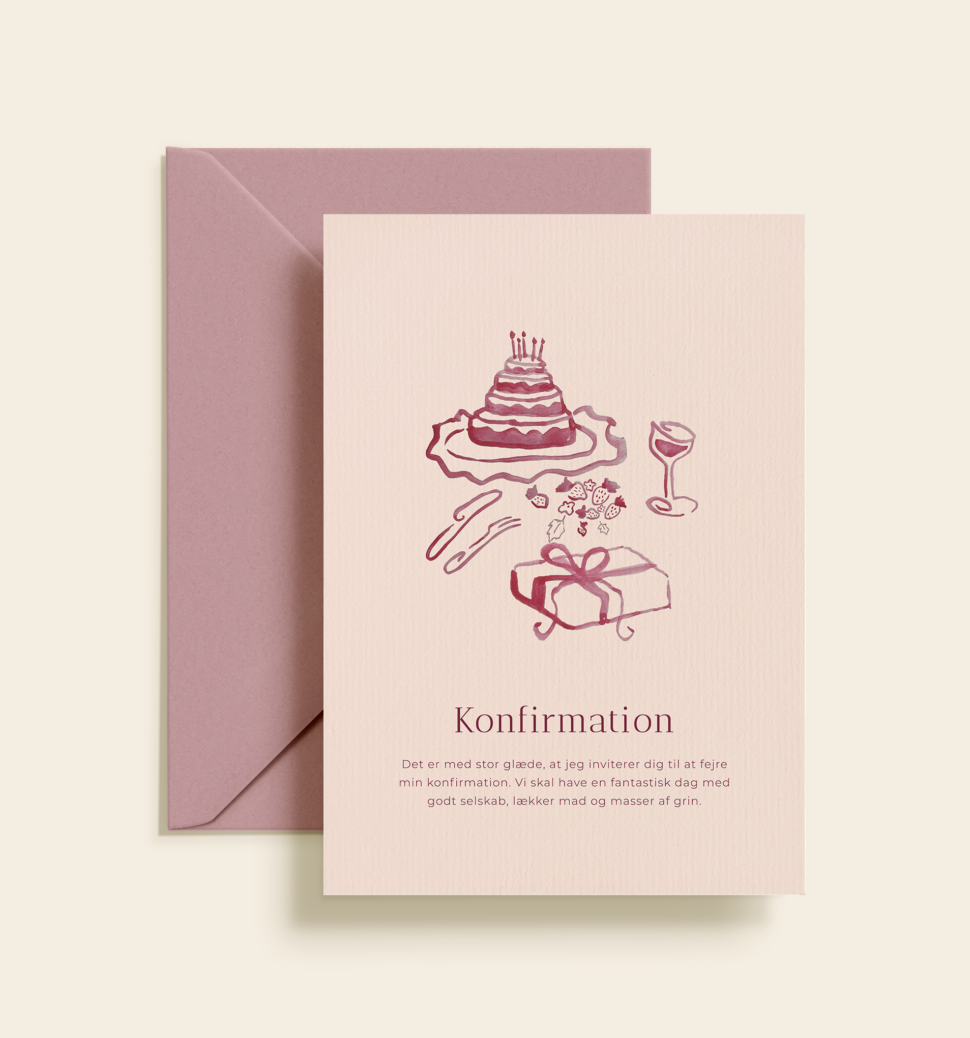 Dette konfirmationskort har et varmt og festligt udtryk med fine, håndtegnede illustrationer, der indbyder til fejring og glæde. Motiver som lagkage med lys, gave og vinglas er illustreret i bløde rosa nuancer, som skaber en let og indbydende stemning, der passer perfekt til en mindeværdig konfirmationsdag.