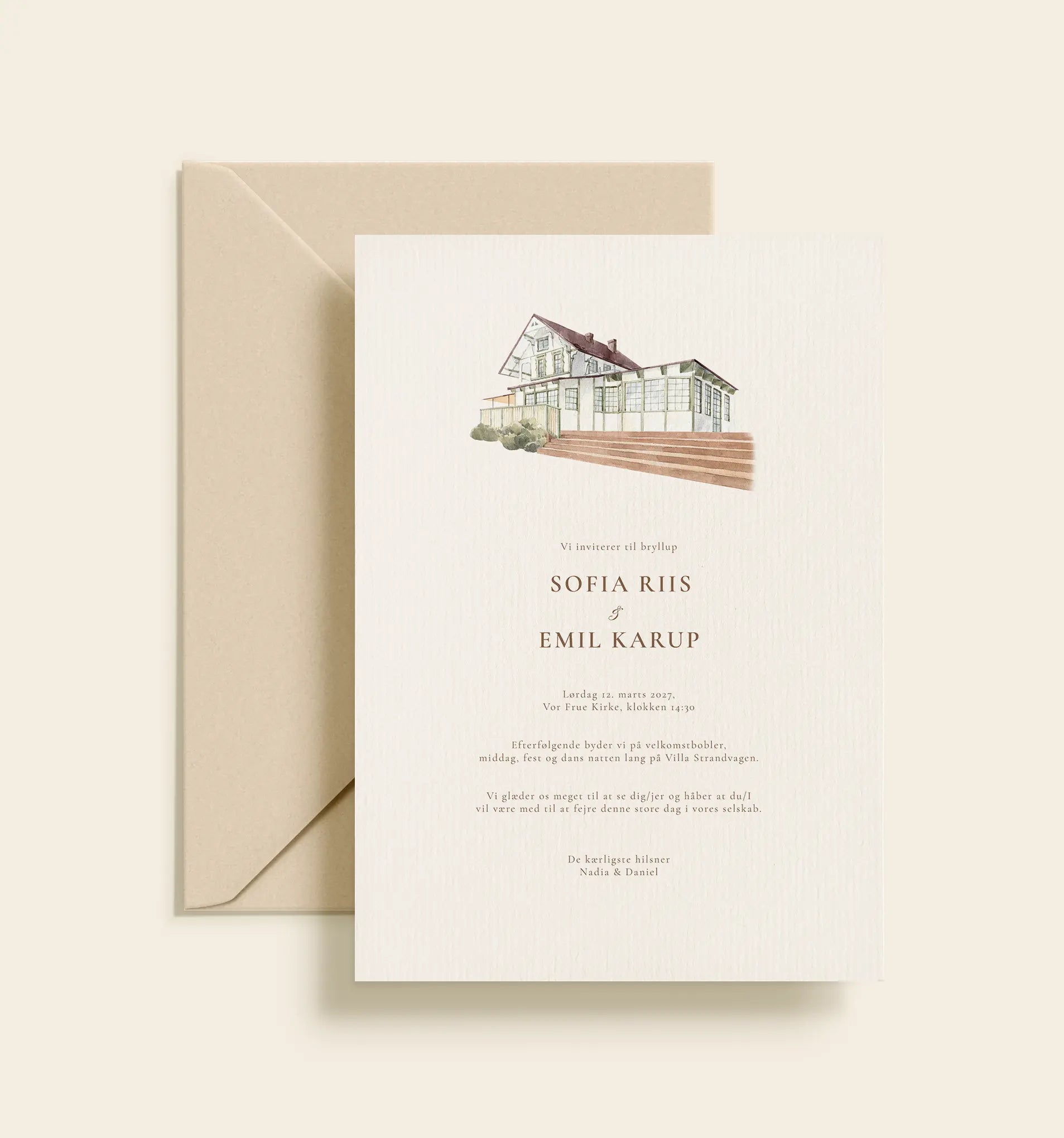 En romantisk bryllupsinvitation med en smuk akvarelillustration af Villa Strandvangen, trykt på eksklusivt papir og sammensat med en klassisk og elegant typografi der skaber et lyst og tidløst udtryk.