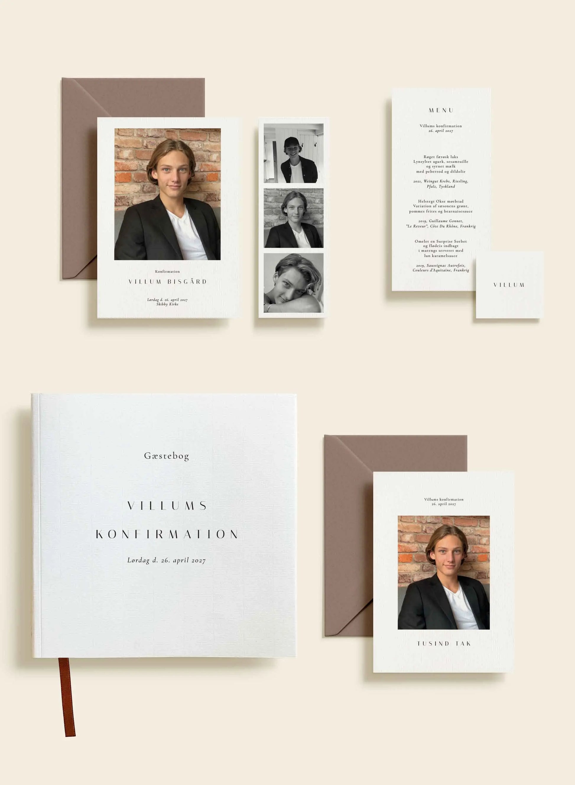 Et stilrent takkekort til Villums konfirmation, trykt på eksklusivt papir og sammensat med en minimalistisk og elegant typografi, der skaber et personligt og tidløst udtryk.