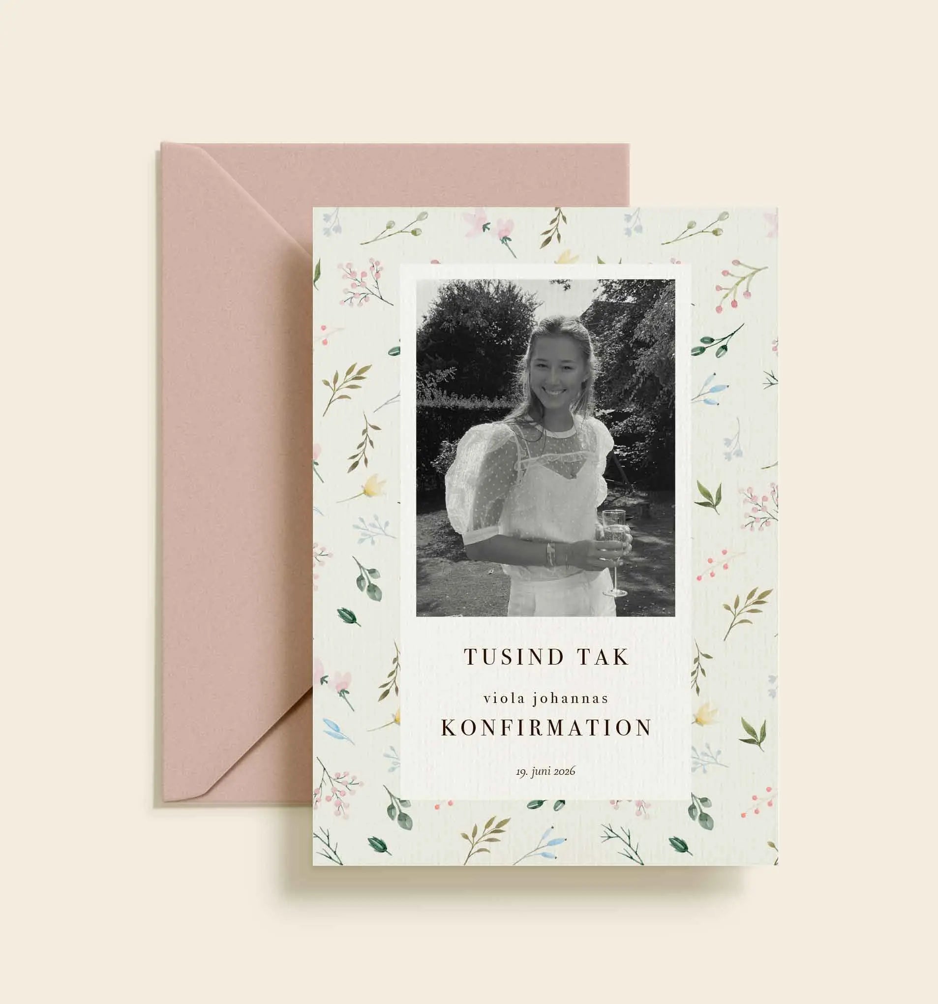 Et romantisk takkekort fra Viola Johannas konfirmationsserie, trykt på eksklusivt papir og sammensat med en elegant typografi i en mørk kontrastfarve. Det personlige foto og det fine blomsterprint skaber et smukt og mindeværdigt udtryk – perfekt til at sige tak efter en særlig dag.